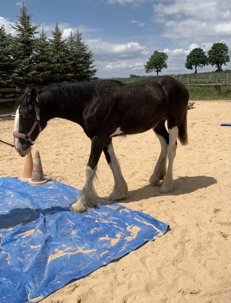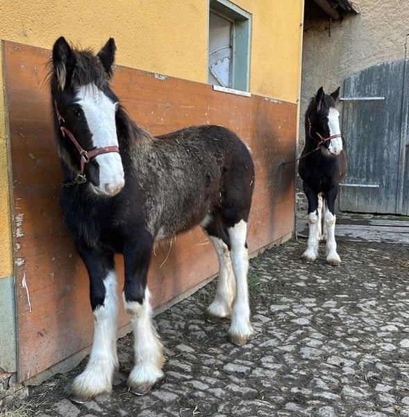 Shire Horse Stute, geb. 2024, aktuell ca. 1,65 m (im Wachstum) – ruhig, neugierig & absolut gelassen Schweren Herzens- Aufgrund veränderter Umstände suche ich für meine junge Shire Horse Stute ein passendes, langfristiges Zuhause. Kein Notverkauf. Sie ist eine sehr ruhige, ausgeglichene und neugierige Stute, die sich durch ihre Gelassenheit besonders hervorhebt. Neue Situationen werden von ihr aufmerksam und interessiert erkundet, ohne dabei hektisch oder panisch zu reagieren. Im Umgang zeigt sie sich freundlich, verschmust und menschenbezogen. Sie genießt Aufmerksamkeit, lässt sich sehr gerne putzen und sucht auch aktiv die Nähe zum Menschen. Für ihr Alter bringt sie bereits viel mit: – kennt Bodenarbeit und erste Gelassenheitsübungen – lässt sich problemlos führen und anbinden – Tierarzt und Hufschmied sind kein Problem – kennt Hunde, Kinder, Autos, verschiedene Umweltreize, Wasser, Plane, Schirm etc. Alleine spazieren gehen ist problemlos möglich. Sie wächst im Herdenverband auf, ist rangniedrig und sehr verträglich. Im Wesen ruhig und eher introvertiert: In unsicheren Situationen bleibt sie zunächst stehen und beobachtet. Mit ruhiger, klarer Führung gewinnt sie schnell Vertrauen und lässt sich sicher durch neue Situationen begleiten. Für ihr Alter sehr gelassen und grundsätzlich auch für Anfänger geeignet – das junge Alter sollte jedoch berücksichtigt werden. Freizeit-, Aufzucht- sowie späteres Reit- oder Fahrpferd. Rappe mit vier weißen Abzeichen an den Beinen und schönem Behang Aufgrund der Größe der Eltern (ca. 1,90 m) ist von entsprechendem Endmaß auszugehen. Transport ist gegen Aufpreis möglich. Zubehör kann ebenfalls gegen Aufpreis übernommen werden. Regelmäßig geimpft, entwurmt und gesundheitlich ohne Befund, Barhuf, Pass vorhanden. Gravel Pit Trudy - Rappe Vater: Gravel Pit Lord Ashby - Rappe Mutter: Gravel Pit Amper - Rappe