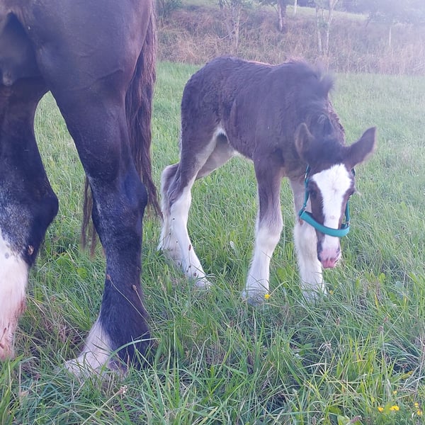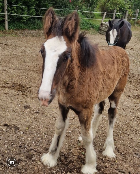 Thank you for your interest in our Shire Horse filly Eve. Eve was born in the summer of 2023 and will soon be able to move into a species-appropriate, new home with a horse company. Her teddy bear look is particularly striking, which has earned her the nickname "Flauschi". Eve grows up in a herd and spends a lot of time with her playmates every day. She is very people-oriented and sweet to deal with, loves long strokes and is always curious and playful. But she also likes to test. She knows the halter and can already be led well. Of course, she will be dewormed regularly and provided with all the necessary vaccinations at the time of delivery. Eve also coped well with the first farrier visits. Both parents can be viewed on our farm. If you are looking for a Shire Horse with a gentle and people-oriented character, which you would like to lovingly accompany to your life as a partner at your side, please contact us, preferably via whatsapp. Our animals are only given into the best hands and an age-appropriate home, so it is important to us to take enough time for interested parties. We look forward to hearing from Eve.
