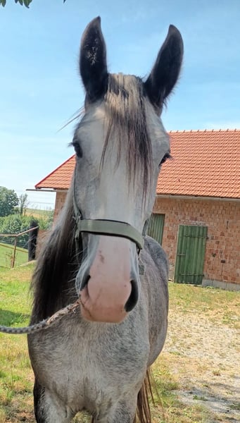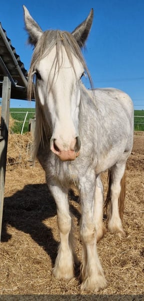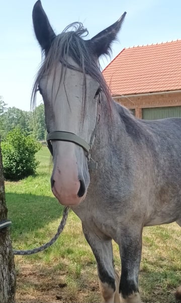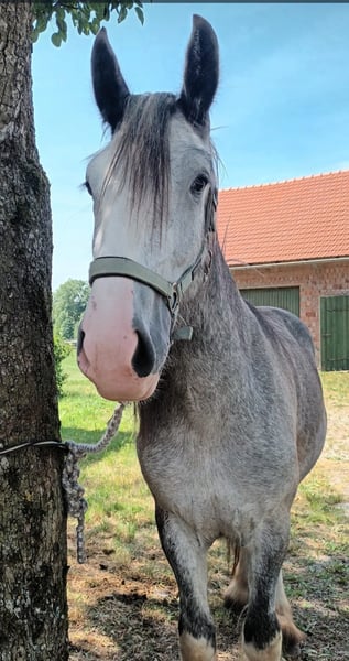 SCARLETT Scarlett was born in March 2021 and is a beautiful Shire Horse mare of the old breeding line type. Due to her lineage, she promises to be an impressive representative of the Shire Horse breed. Both of her parents are large, sturdy, very people-oriented, and friendly in character. Scarlett is also very people-oriented, affectionate, and gentle in handling due to her past. Daily interactions with her are completely uncomplicated. Leading, tying, grooming, picking up hooves, veterinary visits, loading onto a trailer, etc., have all been going smoothly so far. However, she is often a bit skeptical of unfamiliar things at first. She seems to have inherited this from her mother, who is very safe to handle but initially observes everything and everyone with a critical eye. Scarlett currently lives in a loose housing system with other Shires of different ages and has shown herself to be healthy and robust so far. Of course, Scarlett is vaccinated and is regularly dewormed. Additionally, she has full papers from the English Shire Horse Society. This means that she could later be used as a breeding mare according to the guidelines of the English Shire Horse Society. Next year, Scarlett will turn 5 years old. This means she can now be gently prepared for training next year through groundwork, walks, and in-hand training, etc. Those who are considering starting their future life horse themselves and have the necessary time to grow together will find a perfect partner in Scarlett. Our animals are only placed in the best hands and an age-appropriate home, so it is important for us to take enough time for interested parties. It is also important to us that the horse has a say in the decision, as the chemistry must also be right for our animals. We would also like to mention that we have a network of professional transport companies and are happy to provide recommendations if needed. A meeting with Scarlett can be arranged very gladly. If interested, we would be happy to schedule a joint appointment so that a mutual acquaintance can take place in a calm and stress-free manner. We kindly ask for written communication via inquiry/email/WhatsApp in advance, as we have set our phone to silent in the stable and would like to get back to you as soon as we have "horse-free" time. We will then get back to you as soon as time allows, but we ask for your understanding that the care of our horses may lead to a response taking a little longer. However, we are committed to getting in touch with interested parties as quickly as possible. By the way, the photos clearly show the typical color change of the gray horse. However, Scarlett can be seen in all the pictures :-) Further impressions of our horses can also be found on our WhatsApp channel. If interested, we would be happy to send you the link. We look forward to hearing from you regarding Scarlett.