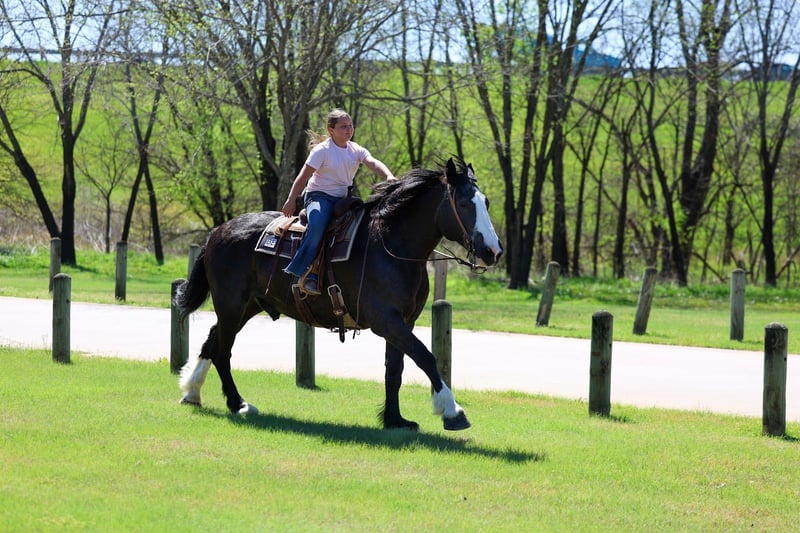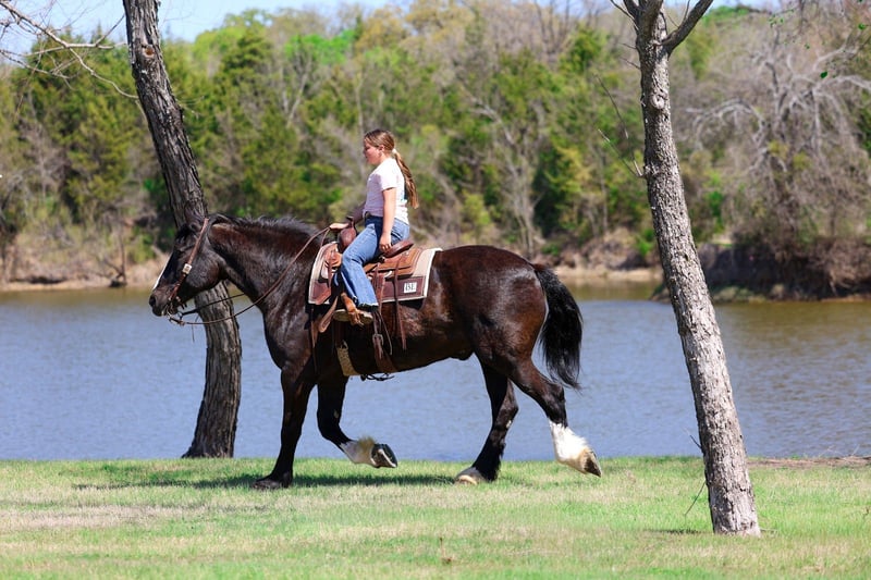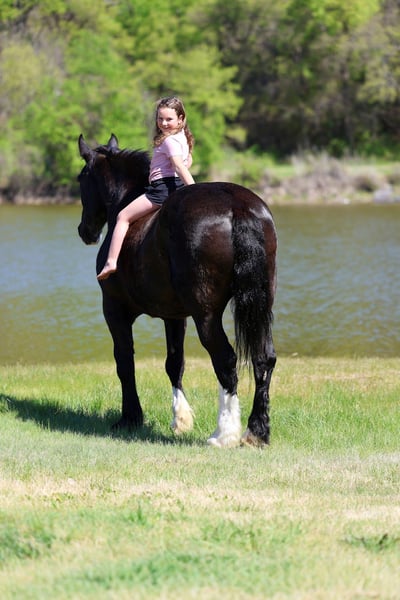 🌟𝑨𝒑𝒓𝒊𝒍 𝐀𝐋𝐋 𝐒𝐓𝐀𝐑 𝐋𝐈𝐍𝐄𝐔𝐏🌟 Happening now thru MONDAY | APRIL 6th - Available EXCLUSIVELY on HorseBid's website! For more details and to register visit: www.Horsebid.com CONSIGNOR CONTACT: MM Ranch 469-318-1902 LOCATION: Forney, TX BREED: Shire Crossbred REGISTERED: No COLOR: Black HEIGHT: 16.2 AGE: 16 GENDER: Gelding This is one is a good one. ☝️ Meet Wells Fargo. A shire crossbred. Yes he is a half shire. He is an unbelievable cool horse. Absolutely as gentle and sweet as a puppy. And so much fun to ride. Wells Fargo is a 16.2 hands tall stunning black gelding. This is one cool crossbred horse. He is so sweet and loves attention. He will walk right up to you in the pasture and he wants you to catch him. He loves going on adventures. Truly loves being around people. Seriously you cannot walk out to the pasture without him being in your pocket and wanting to follow you everywhere you go. Wells Fargo came off a big ranch in Montana. Where he was being used like a ranch horse. They used him like as if he was a small quarter horse. He doesn’t know he is big. Really he is a perfect size for a crossbred. He is big but not too big. They treated him just like all the other horses. They did all the chores on him. From pulling a hay wagon to put out hay. (Both single and double). To riding out on the ranch to check cattle. To packing supplies up into the mountains. Even has been roped off of. He is what I would call a seasoned trail horse that has extensive seen lots of country. Been in the steepest parts of the mountains. He can handle any terrain. Can also handle being in town around cars, big trucks, trains, bikes, etc.. Loves to cross water (so he can play in it). Has had a gun shoot off of him and around him. Used durning hunting season as well to pack out deer and elk. He is been there done that type. Has had lots of mileage put on him. For a big horse he has the smooth trot and lope. And super easy to get into a lope. You don’t have to kick hard. Just give him a smooch. Has a lot of handle. Neck reins. Backs. Side passes. Really broke and soft in the bridle. Responsive to all cues. Whether on his back or on the ground. You don’t have to pull hard. He is very soft both in his mouth and to side cues. We just ride him with simple short shank snaffle. He is also aware and cautious with his surroundings. Our little sweet 12 lb puppy is always running around his feet and also the kids. He makes sure to not step on them. I would say Wells Fargo is suitable for any age or riding experience. He is safe. Absolutely no bad habits or quirks about him. I think he would make an excellent mount police horse. He has so much experience and patience that would make him perfect for those situations. Nothings scares him. Not all at spooky or over reactive. He is experienced around being in town around traffic and all the excitement. Wells Fargo doesn’t require anything special. We use our standard size saddle, girts, and a quarter horses headstall and bit. We didn’t have to get anything extra or special for him. He is an easy keeper. He is sound in every way. Absolutely healthy. Nothing wrong with him. We did have a pre evaluation done on him by our vet. (Will include in the pics). Horses like Wells Fargo are few and far between. Your neighbors won’t have one like him. You will stand out riding him. He is absolutely beautiful. Call us if you would like anymore info about him. We would be happy to help you arrange shipping on him anywhere.