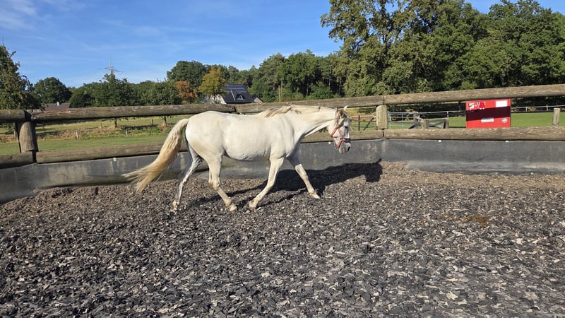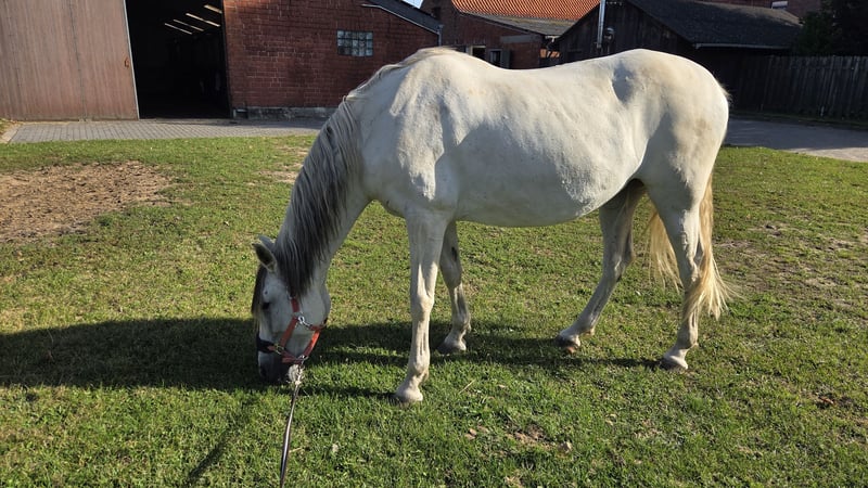 Aus gesundheitlichen Gründen meiner Seite biete ich hier meine Stute zum Verkauf an. Ich werde ihr durch meine Einschränkungen reiterlich nicht mehr gerecht. Urania möchte gern gefallen und regelmäßig gearbeitet werden. Sie ist vom Wesen her eher schüchtern, rangniedrig und schreckhaft. Sie ist kein Kinder/ Anfänger Pferd. Wenn sie sich erschreckt wirft sie den Kopf hoch und macht schon mal einen Sprung zur seite. Enge ist auch nicht ihr Ding. So mag sie es nicht gern wenn zu viele Reiter in der Halle/Platz sind und zu dicht an ihr vorbei reiten. Bodenarbeit findet sie super. So zirkelt sie gern frei neben mir her. Schritt, Trab und so langsam kommt auch der Galopp. Ausreiten in der Gruppe ist kein Problem. Allein kann ich nichts zu sagen da ich das nicht mache. Unter der Schweifrübe hat sie drei kleine Melanome die sie bisher aber nicht beeinträchtigen. Bei Intetesse schreiben sie mich gern über whats app oder e mail an da ich nicht immer ans Telefon gehen kann. Nach erstem Kontakt rufe ich sehr gern zurück.
