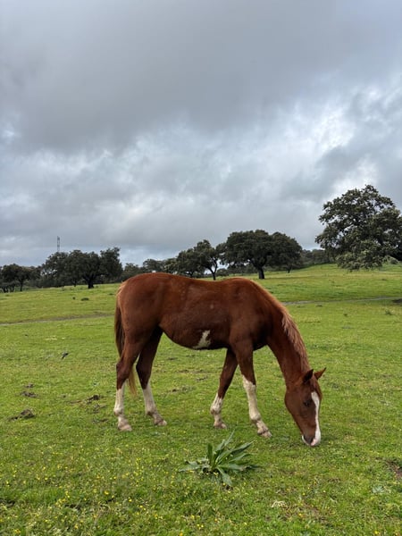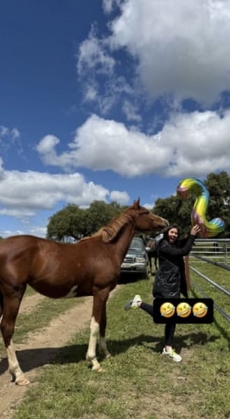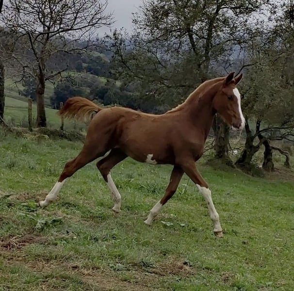 Está potra de 2 años y medio nieta de SANTANO, es increíblemente amable y está tratada con cariño y respeto desde que ha nacido. Desde los 9 meses está en mis manos y se deja hacer de todo. He ido a dar paseos al campo del ramal con ella, yo misma le he hecho los cascos y ahora el podólogo puede trabajarla suelta y sin ningún tipo de problema. Amable con el veterinario también. Totalmente limpia y además de preciosa tiene un físico y unos movimientos increíbles. Y un carácter muy dulce. Hay fotos y vídeos desde pequeña hasta ahora. En dos semanas subiré nuevos vídeos y fotos . Si estás interesado escríbeme. Nuestra prioridad es buscarle una buena casa, así que tal vez el precio podamos negociarlo un poco. Es alazana pero puede verse como pinta, por su padre, y ella ha heredado una mancha en la barriga con forma de águila.