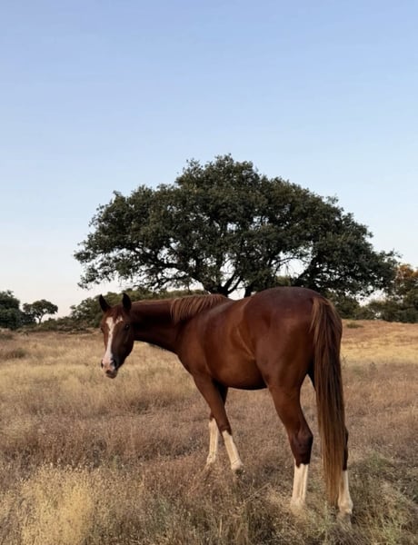 This is a 2.5-year-old filly, granddaughter of SANTANO. She is incredibly gentle and has been treated with love and respect since birth. She has been in my hands since she was 9 months old and is very well handled; she allows everything. I have taken her on walks in the fields of Ramal, and I have even trimmed her hooves myself, so now the farrier can work on her loose and without any issues. She is also very friendly with the veterinarian. Completely clean, she is not only beautiful but also has an incredible physique and movement. Her temperament is very sweet. There are photos and videos of her from when she was a foal up to now. In two weeks, I will upload new videos and pictures. If you are interested, please contact me. Our priority is to find her a good home, so we might be willing to negotiate the price a bit. She is a chestnut, but her markings resemble those of a paint horse, inherited from her sire. She has a distinctive eagle-shaped mark on her belly.