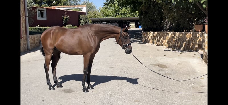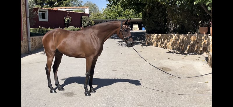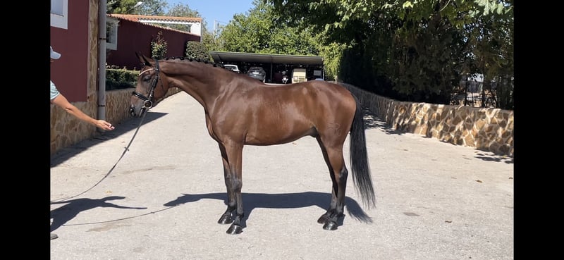 Goloso ist ein 7-jähriger, kastanienfarbener CDE mit einer Schulterhöhe von 1,63 m. Er zeichnet sich durch sein außergewöhnlich edles, ruhiges und ausgeglichenes Wesen aus, verbunden mit dem nötigen Funken für sportliche Leistungen. Er ist sowohl für Reiter geeignet, die einen sicheren und angenehmen Partner für eine sanfte Reitweise und Ausritte ins Gelände suchen, als auch für fortgeschrittene Reiter, die ein Pferd mit solider Ausbildung, gutem Dressurniveau und fortgeschrittenen sportlichen Anforderungen wünschen. Goloso wurde mit Ruhe und Sachverstand gearbeitet, nach einer progressiven Dressur, die seine individuellen Bedürfnisse und seine Anatomie respektiert, ohne Überforderungen – stets im Sinne des Tierwohls. Was sein Dressurniveau betrifft, ist Goloso vollständig auf Niveau 4 etabliert, mit allen drei Grundgangarten bestätigt und von ausgezeichneter Qualität: ein weicher, entspannter Schritt, ein elastischer, ausdrucksvoller Trab sowie ein ausgewogener, sehr guter Galopp. Er zeigt harmonische Bewegungen mit guter Cadence und besitzt große Leichtigkeit bei Übergängen, Rhythmenerhaltung und Konstanz in allen Situationen. Er beherrscht zuverlässig Übungen der Doppelspur, wie Seitengänge, Seitengänge mit Anlehnung und Rücken-in, sowie fließende Wechsel, Pirouetten und Rotationen mit Korrektheit, Balance und Leichtigkeit. Seine Bereitschaft zum Arbeiten und sein Verständnis für die Übungen spiegeln eine sorgfältige, progressive und respektvolle Dressur wider, die ihm eine positive Einstellung und gute Mitarbeit im Training ermöglicht. Goloso ist an das Gelände gewöhnt und zeigt dort eine ruhige, vertrauensvolle Reaktion in natürlichen, Außenreitumgebungen. Er ist sowohl in der Halle als auch draußen sehr vielseitig und ausgeglichen, was ihn zu einem vielseitigen und harmonischen Pferd macht. Besonders hervorzuheben sind seine leichte Handhabung, sein weicher Maul und seine ausgezeichnete Einstellung sowohl in der Halle als auch im Gelände – ein ideales Pferd für den Alltag, das keine Probleme macht. Ein Pferd mit viel Herz, Gelassenheit und großem Potenzial, bereit, gemeinsam mit seinem nächsten Reiter weiterzuentwickeln.