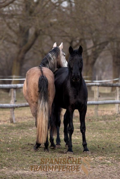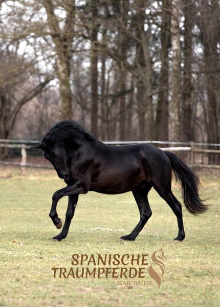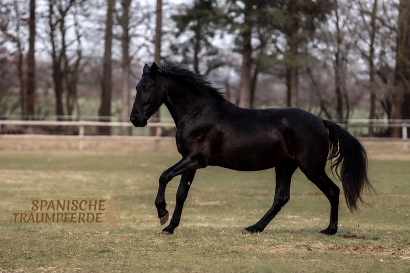 ¿Siempre has soñado con un caballo negro azabache? Ahora puedes hacer ese sueño realidad con nuestro hermoso caballo de 3,5 años, un alazán de 1,45 m✨SIRIUS SH✨. Este magnífico caballo PRE brilla con su pelaje negro como la noche, que parece engrasado a la luz del sol. Pero no solo su llamativa coloración lo hace especial; también su carácter amable y muy educado lo distingue. Además, su físico de tipo barroco, combinado con un movimiento amplio y elegante, lo convierten en un caballo de doma cómodo y de buen paso. Actualmente, debido a su juventud, nuestro hermoso alazán se está introduciendo principalmente en el trabajo en tierra para prepararlo para su futura vida como caballo de montar. Ya ha aprendido a llevar silla y jinete. Bajo el jinete, Sirius se mueve con suavidad en las bases del paso, trotón y galopando, y ya en el comienzo de su formación ecuestre, transmite una sensación segura y confiada a su jinete. SIRIUS SH no es un caballo atrevido; es muy sensible, algo cauteloso y requiere que su corazón sea conquistado. Pero una vez que logres ganarte su confianza, abrirá su gran corazón y te convertirá en un amigo de por vida. Los vídeos están disponibles en mi página web: www.spanische-traumpferde.de Será un placer que puedas conocer a este maravilloso caballo en persona. Se recomienda concertar una cita previa. Para ello, dedicamos suficiente tiempo y, por protección de nuestros caballos, cobramos una tarifa de 50 €. Los vídeos están disponibles en mi página web: www.spanische-traumpferde.de Se disponen de radiografías. Ubicación: 23795 Traventhal