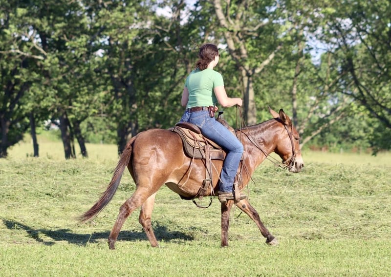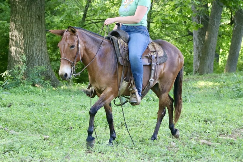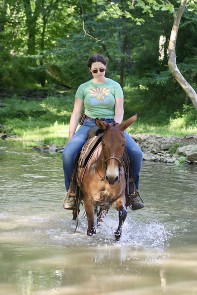 ONLINE AUCTION Place your bids at www.PlatinumEquineAuction.com Starting Bid $3500 Auction ends June 23rd, 2024 Need a new saddle? Check out White Rock Saddles on our website or Facebook! Josie is a 14.1 hand, 13 year old gaited molly mule. She is a super sweet and honest mule that the whole family loves! Don’t let her height fool you, she is stocky made and carries her rider well. She is very solid on the trails. She is careful and sure footed. Rides confidently on various terrain and crosses natural obstacles with ease. She is a smooth ride and has the best ear flopping walk you can find! She rides with the group well. Whether it’s leading, in the middle, or behind, she is happy to ride wherever. If you want to ride out alone, she does that quietly and confidently as well. She will happily walk away from the trailer with other horses/mules left behind and not cause a fuss. Josie is quiet and gentle when kids want to mess with her. She nicely lets them lead her, ride her, and climb all over her! We have trail ridden her double with our toddlers riding with us. She is traffic safe, and we have ridden her around farm equipment working with no issues. She picks up her feet nicely. Stands for saddling and mounting. Travels well. She’s been on countless overnight camping trips. Josie is a special mule that anyone is sure to love and enjoy! For more information, call Waugh Livestock Sammi 704-798-5497 Located in Brooksville, KY. ONLINE AUCTION Place your bids at www.PlatinumEquineAuction.com Starting Bid $3500 Auction ends June 23rd, 2024 Need a new saddle? Check out White Rock Saddles on our website or Facebook!