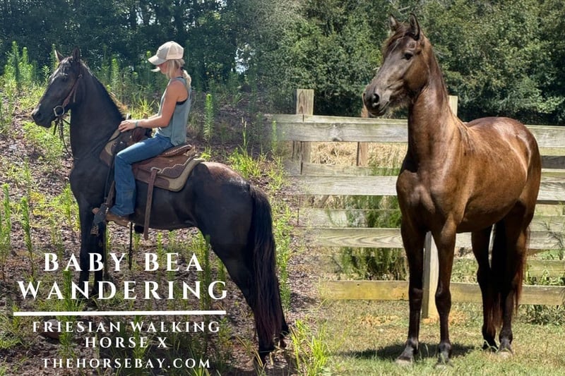 2022 Black Friwalker (Friesian/Tennessee Walker) Mare 15.2hh FHH registered. She has had 30 days under saddle and is already a smooth, smart, gaited mare that will go anywhere. She loads and Unloads, stands tied for farrier and bathing. Easy to catch and in your pocket. She is fully spayed, due to an abnormality with her ovaries when she was 2 weeks old. Vet notes from Auburn University are available. She cannot reproduce but is a normal horse in every other sense.