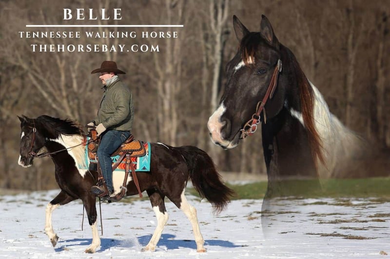 OPEN BIDDING ON THEHORSEBAY,COM. SALE ENDS ON 01/29. More information is available on the website, including an UTD vet inspection, Coggins, video, images, and the owner's contact information to ask questions, request information, or make arrangements to come to visit. Belle stands around 14.3h, she is well built, and she is a beautiful black tobiano mare. Belle has been ridden throughout Big South Fork in TN, and she knows all about those rough, rocky trails and knows how to handle herself. She will go up or down even steep slopes, across deep creeks, over downed trees, and over all types of rough terrain while still being sure footed. She has been ridden in traffic, and is very traffic safe around cars, semi, log, and dump trucks. If you need a smooth ride that won’t hurt your back??? Then look no further! Not only does she have the looks, but she also has all the right moves! Belle has that smooth true 4-gait that is comfortable for hours in the saddle and your back and your bottom will thank you! She does great out in the pasture with our mixed herd. She has a great attitude about whatever she is asked to do.