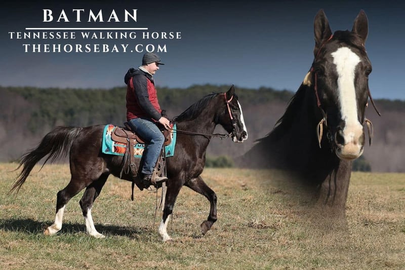 OPEN BIDDING ON THEHORSEBAY,COM. SALE ENDS ON 02/26. More information is available on the website, including an UTD vet inspection, Coggins, video, images, and the owner's contact information to ask questions, request information, or make arrangements to come to visit. Batman is an eye-catching Black roan, Tennessee Walking gelding that is standing 14.3 hands and 11 years old. Batman has been on camping trips, picket line-tied, and hauled to several states. He will flatfoot walk on a loose rein, or he can move on out if you ask. He has a smooth and natural 4-beat gait that anyone will enjoy riding on! Batman has been shown at local fun shows in pleasure classes and seen it all, from the bright lights to hearing those blaring loudspeakers. He has seen it all and handles everything in stride! He has been exposed to all kinds of wildlife, such as deer or turkey, or other animals like cows or dogs, and will go anywhere that he is asked to. He has ridden many miles in the mountains of Eastern Kentucky and encountered every obstacle possible on the trail. He will go up or down even the steepest slopes, across deep creeks, over downed trees, and all rough terrain while still being sure-footed. He has been ridden in traffic and is very traffic-safe around cars, semis, logs, and dump trucks. If you are looking for that special trail riding partner, look no further!!