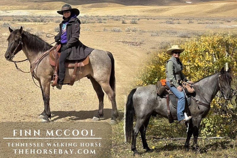 Deze prachtige ruin is een 8-jarige, geregistreerde Tennessee Walking Horse met opvallende blauw-roan kleur en adembenemende amberkleurige ogen. Met een schofthoogte van 14.2 handen is Finn het totaalpakket: schoonheid, goed opgevoed, en die klassieke glijdende Tennessee stap, wat aanvoelt als rijden op een wolk. Hij beweegt moeiteloos en, eenmaal in gang, heeft hij zeer weinig hulp van zijn ruiter nodig om in gang te blijven. Hij is ervaren, vooruitstrevend en klaar om de paden op te gaan. Hij houdt ervan om samen met zijn ruiter de paden te verkennen en is zeer zeker van zijn voet. Hij staat stil om te worden opgezadeld vanaf de grond of een opstapblok, een steen, de loopplank van de trailer, enzovoort. Hij steekt elk water over, inclusief plassen. Hij steekt bruggen over stromend water of een wipwapbrug in een arena over. Hij sleept bereidwillig takken, kan goed achteruit lopen en heeft geen problemen met een regenjas of een tarp. Hij staat stil voor de hoefsmid, kan gemakkelijk gewassen worden en laadt bereidwillig in een trailer met of zonder oprijplaat. Hij is up-to-date met vaccinaties, tandheelkunde, ontworming en Coggins.