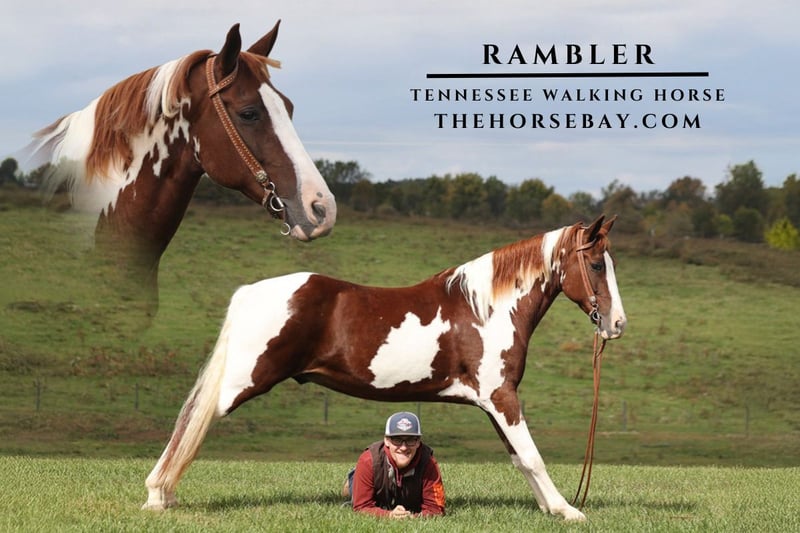 OPEN BIDDING ON THEHORSEBAY,COM. SALE ENDS ON 10/30 @ 4:20PM CT. More information is available on the website, including an UTD vet inspection, Coggins, video, images, and the owner's contact information to ask questions, request information, or make arrangements to come to visit. Rambler is an eye-catching sorrel tobiano, Tennessee Walking Horse gelding standing around 15hh and is seven years old. Rambler has been my grandpa’s prize possession and has been his main horse, but at almost 74 years old, his knees are giving out, and he no longer wants to ride, so my girlfriend has been riding Rambler this summer/fall, and we have had him on lots of weekend long camping trips. He will picket line tie and trailers well, and we have hauled him to state parks. Rambler is the type of horse that any family member can ride, he is super safe, quiet and gentle. He is very beginner-friendly, and if you can hold the reins, you can for sure ride him! He will flatfoot walk on a loose rein, or he can move on out if you ask. He has a smooth and natural 4-beat gait that anyone will enjoy riding on! Rambler has been shown at local fun shows and ridden by kids as young as 6, in pleasure classes, and seen it all from the bright lights to hearing those blaring loudspeakers. Rambler has seen it all and handles everything in stride! He has been exposed to all kinds of wildlife, such as deer or turkey, or other animals like cows or dogs, and will go anywhere he is asked to. He has ridden many miles in the mountains of Eastern Kentucky and encountered every obstacle possible on the trail. He will go up or down even the steepest slopes, across deep creeks, over downed trees, and all rough terrain while still being sure-footed. He has been riding in traffic and is very traffic-safe around cars, semis, logs, and dump trucks. If you are looking for that special trail riding partner, look no further!!