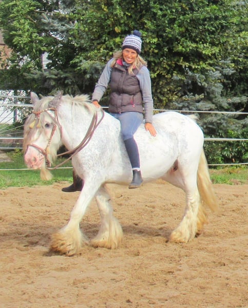 Rijke Tinker merrie in blue blagdon, volledige afstamming, heeft al veulens gehad, momenteel bereden, vriendelijk en aanhankelijk, onbevreesd, kent honden en tractoren, lief voor andere paarden