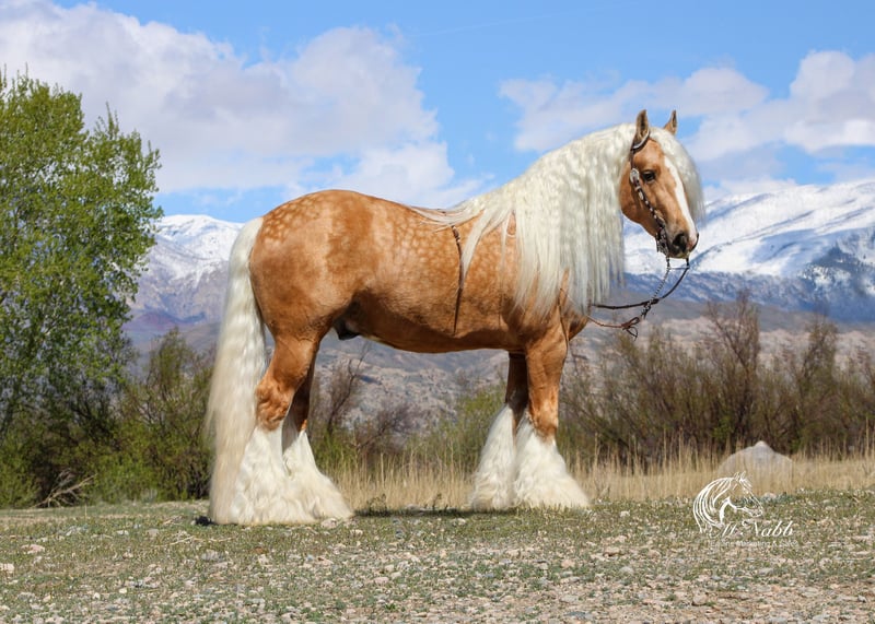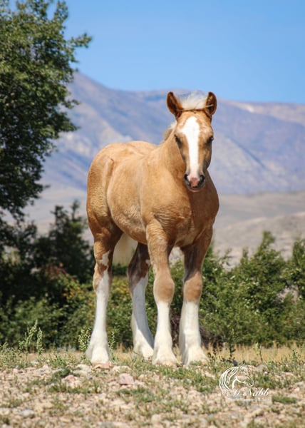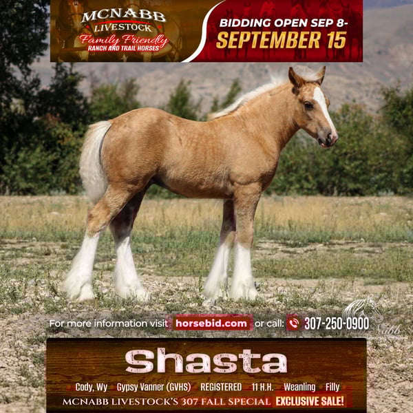 𝕄ℂℕ𝔸𝔹𝔹 𝕃𝕀𝕍𝔼𝕊𝕋𝕆ℂ𝕂's 🍂𝟑𝟎𝟕 𝐅𝐀𝐋𝐋 𝑺𝒑𝒆𝒄𝒊𝒂𝒍🍂 Happening now thru MONDAY | SEPTEMBER 15th - Available EXCLUSIVELY on HorseBid's website! For more details and to register visit: www.Horsebid.com CONSIGNOR CONTACT: McNabb Livestock LLC 307-250-0900 LOCATION: Cody, Wy BREED: Gypsy Vanner (GVHS) REGISTERED: Yes REGISTERED NAME: Bayley's Little Shasta (Pending) COLOR: Palomino HEIGHT: 11 AGE: Weanling GENDER: Filly Shasta is just the sweetest filly. She is home raised and not one we were planning on selling but sometimes in life you have to make some sacrifices. Our loss and your gain. She is out of top quality Gypsy Vanner stock. Since we had not intended to sell her we have not done her registration paperwork yet but we will guarantee her to be GVHS registered. She has been handled correctly since birth, lots of baby training and she has gone with her dam driving in town, through parades and for the grand entry during the Cody Stampepde Rodeo. She is not bothered by the noise or commotion. She loved the attention that everyone would give her. She goes over all the trail obstacles in hand and when it is time to start her training to ride and drive she will prepared for it and super easy to work with. Both her sire and dam were very easy to train and they have passed down their great attitudes, willing dispositions and smart trainabily to their foals. Shasta naturally is graceful and flowing in all of her moments. She is easy to catch has a sweet in-your-pocket personality but is very polite and well mannered. Her dam is 14.2 and her sire is 15 hands so she should have good size to her. She will be absolutely gorgeous like her sire with that golden dapple palomino color with 4 high white socks and blaze making her so flashy. She is correctly balanced, straight legged, thick made with a babydoll head and a soft kind eye. She is the whole package of conformation, disposition and color. Shasta was foaled 5/15/2025 we are willing to hold her until 11/15/2025 if you would like before we wean her. She must be insured after purchase. She has had a basic PPE, up to date on vaccinations, worming & farrier. We welcome you to do your own PPE and to come to the ranch a to meet Shasta. We also are glad to help arrange transportation. We will hold the horses at no charge for a reasonable amount of time to get hauling arranged. For more information call 307-250-0900. We have lot more great stories we are glad to tell you about Shasta.