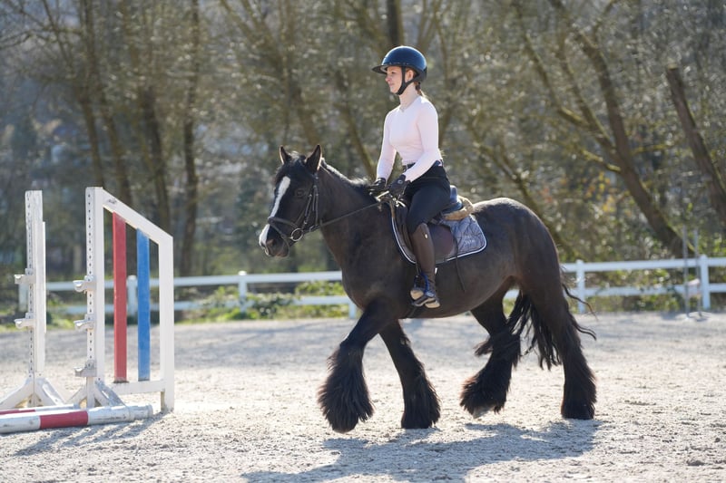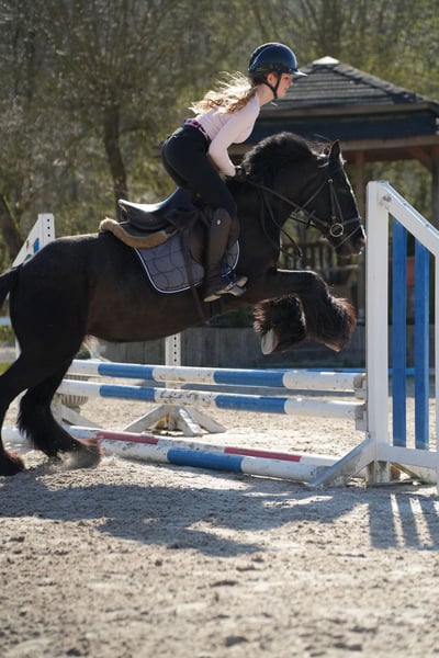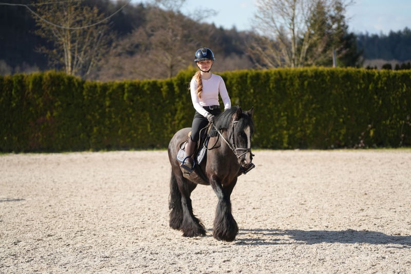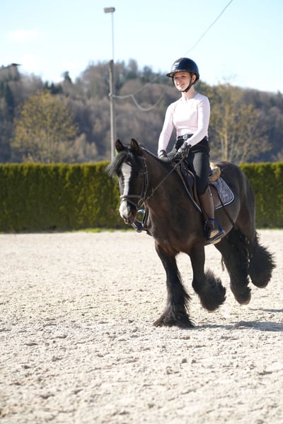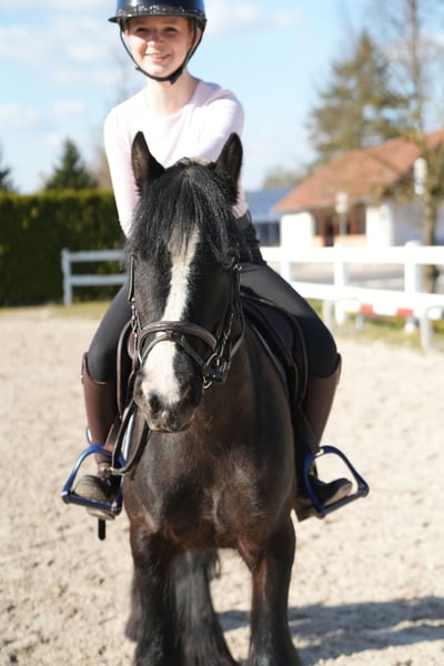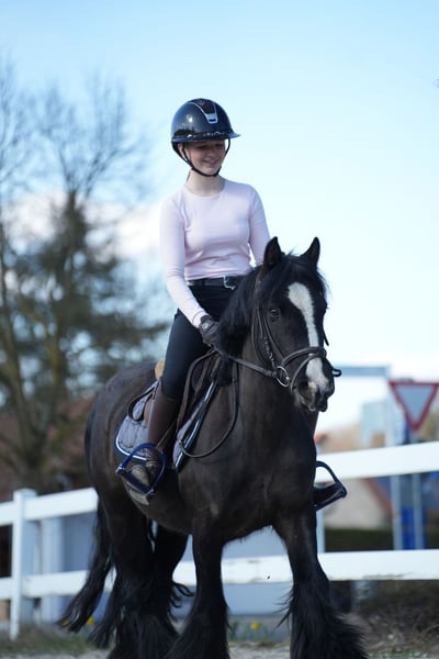 Tinker Stute, noch jung aber sehr brav unter dem Reiter. Egal ob Ausritte, Longenstunden oder Cavalettistunde. Durch ihre stabile Art für Kinder und Erwachsene geeignet.