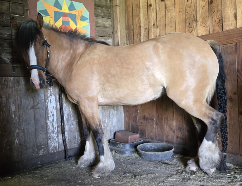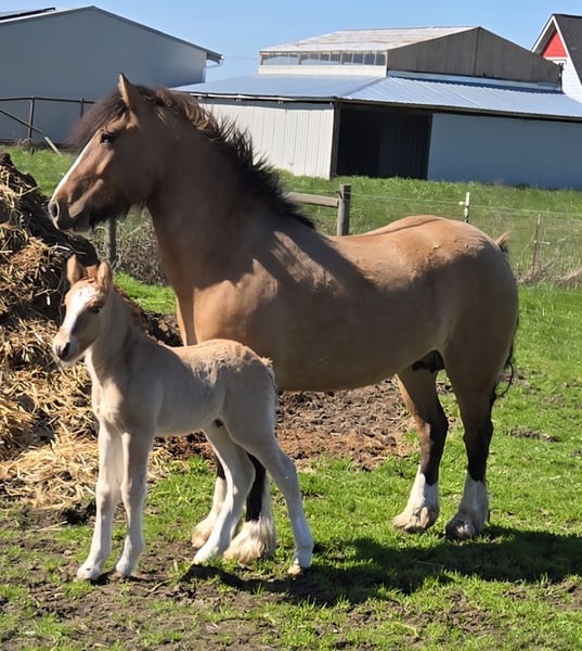 For your consideration, this amazing mare and her stud colt. First, Sienna is a 4 year old gorgeous and sweet little bay dun mare. Her ground works done and has been saddled but has not been started with a rider yet. She is: 1/2 GV (Sire is SRS Deagan) 1/2 Highland Pony (Dam Lussa of McClellan) Highlands are an incredible and rare breed Estimated to mature at 14HH Sienna has beautiful movement, she has so much potential. Eligible for double registration . Her gorgeous colt arrived on March 21st, by GV Flavio Bailey's Cream. The colt has huge bone and is a red roan dun (his Sire is homozygous for roan) He is 3/4 Gypsy Vanner 1/4 Highland Pony. SD lines top and bottom. Please message for additional information and pictures. Located in Willamette Valley area in Oregon.