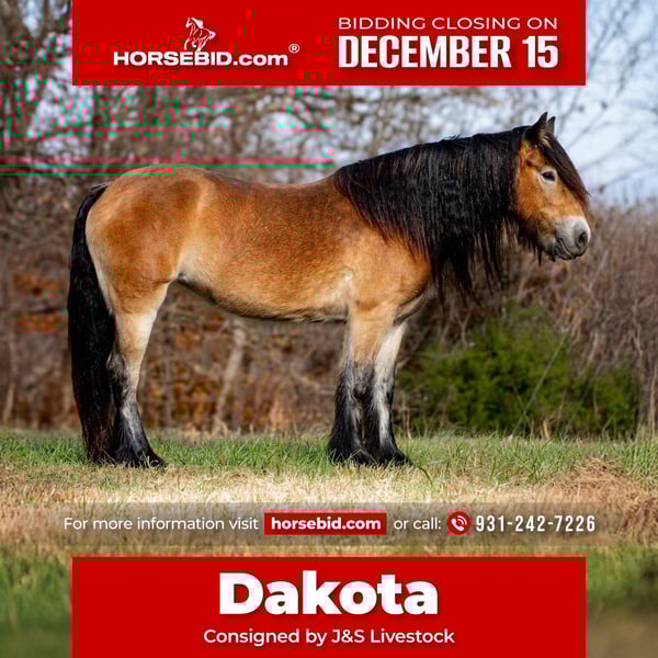 🎄𝐓𝐇𝐄 𝑯𝒐𝒍𝒊𝒅𝒂𝒚 𝐂𝐋𝐀𝐒𝐒𝐈𝐂🎄 Happening now thru MONDAY | DECEMBER 15th - Available EXCLUSIVELY on HorseBid's website! For more details and to register visit: www.Horsebid.com CONSIGNOR CONTACT: J&S Livestock 931-242-7226 LOCATION: Santa Fe, TN BREED: Gypsy Vanner REGISTERED: Yes REGISTERED NAME: Magic’s Dancin Dakota COLOR: Bay HEIGHT: 14.1 AGE: 5 GENDER: Mare “Magic’s Dancin Dakota” If your looking for that safe, steady, and dependable partner to give you or your kids the confidence needed to be able to truly enjoy riding, and see how incredibly fun it is to be horseback- then look no further than Dakota. Standing 14.1hh, making her that perfect height for kids, and even adults. She is built correctly- thick, sturdy and good feet. Not to mention that beautiful flowing mane and tail. Most of all, she is patient with all sorts of riders and her goal is to take care of you. Dakota is extremely user friendly. Even with someone having no experience riding, she sure makes it easy to learn and have fun while doing it! You truly don’t have to worry about giving her the wrong signal, she will stay safe and steady for you to learn and grow with. When it comes to ground manners, Dakota sure does have excellent ones. She loves to be played with and pampered on- from brushing, bathing, to scratches, to braiding her mane and tail all day long, she will stand perfectly still and soak up all the attention you could possibly give her. Shes super easy to saddle and trailer as well. Keep her stalled or turned out, she’s happy with either. You can go out and catch her anywhere she stands, making it hassle free. She will be the same horse every single day- you can leave her sitting for as long as you’d like and you can guarantee she’ll ride right off without any nonsense. When it comes to the trails, Dakota has you covered. When I describe her the phrase that always comes to mind is, “more whoa than go”. This mare is happily content walking along the trails, farm , etc. as long as you’ll let her, but if you desire just ask for a faster speed, and she will do as asked. She will go right into a nice little trot, and pick right up into a lope. Along the trails she will cross water easily, safely take you over fallen down trees, and up and down rocky inclines. She isnt going to spook at any unexpected events that might occur. You can also safely ride her out alone without any worry, she doesn’t have to be rode in a group for you to be able to enjoy a nice, peaceful ride for some relaxation. However, if you prefer to ride her with a group she will do just as good. I can confidently say i feel absolutely anyone can get along with Dakota, and truly love her for the rest of her life. She’s that perfect family / beginner friendly style horse that’s truly hard to find at her age, with such perfect qualities. Dakota has a recent PPE which she passed with flying colors! She has zero bad habits and is sound and sane. For any further information feel free to reach out at anytime- Bailey 931-242-7226