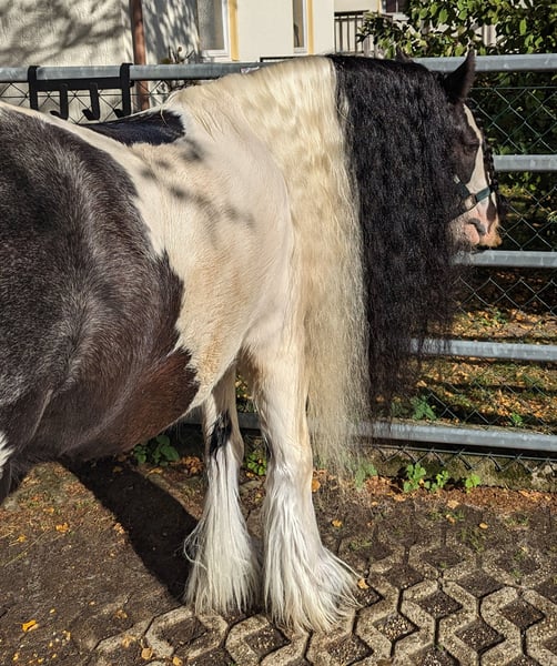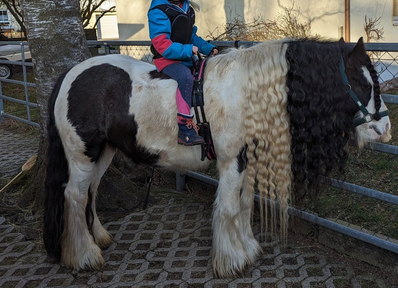 Ich verkaufe umständehalber meine Tinkerstute. Sie ist 2016 in England geboren. Ich habe sie 2020 roh gekauft und selbst ausgebildet. Sie ist geritten und wird einspännig gefahren. Ellen ist ein tolles Pony. Sie ist sehr lieb und ehrlich. Durch die schöne Scheckung und ihren tollen Behang (keine Mauke und Raspe) ist sie ein echter Blickfang. Sie ist sehr bemüht und motiviert und hat eine tolle Arbeitseinstellung. Es wäre schön, wenn ihr Potential noch weiter gefördert wird. Unter dem Sattel zeigt sie sich stets bemüht, alles richtig zu machen. Ellen ist fein zu reiten, benötigt aber einen sicheren und gefühlvollen Reiter um ihr Potenzial zu zeigen. Sie lässt sich aber auch gerne von Kindern reiten. Ellen ist definitiv ein toller Partner zum reiten und fahren. Auch am Boden zeigt sie sich immer lernwillig und ist super aufmerksam. Ellen ist geländesicher, kennt Hunde, Fahrradfahrer etc. - Rappschecke - geb. 07/2016 - keine Unarten, geländesicher, schmiedefromm (sie ist unbeschlagen) verladefromm - 1,36 Stockmaß (trägt problemlos leichtere Erwachsene) - Herdenverträglich (eher rangniedrig) - regelmäßig entwurmt & Zähne gemacht - Impfung aktuell (Tetanus) - Keine schlechten Erfahrungen, ich bin die 1. Besitzerin nach dem Züchter - komplettes passendes Zubehör kann gern zusätzlich erworben werden (auch Kutschgeschirr und Kutsche) Der Preis ist verhandelbar (Platz vor Preis) Ich gebe sie nur aufgrund meiner persönlichen Lebenssituation und schwersten Herzens ab. Mir ist wichtig, dass sie ein gutes Zuhause bekommt und mit ihrem neuen Besitzer gut zurecht kommt.