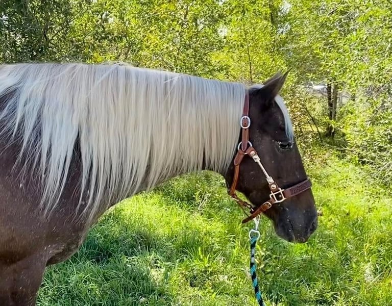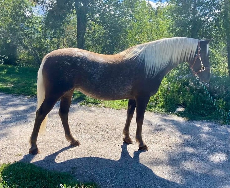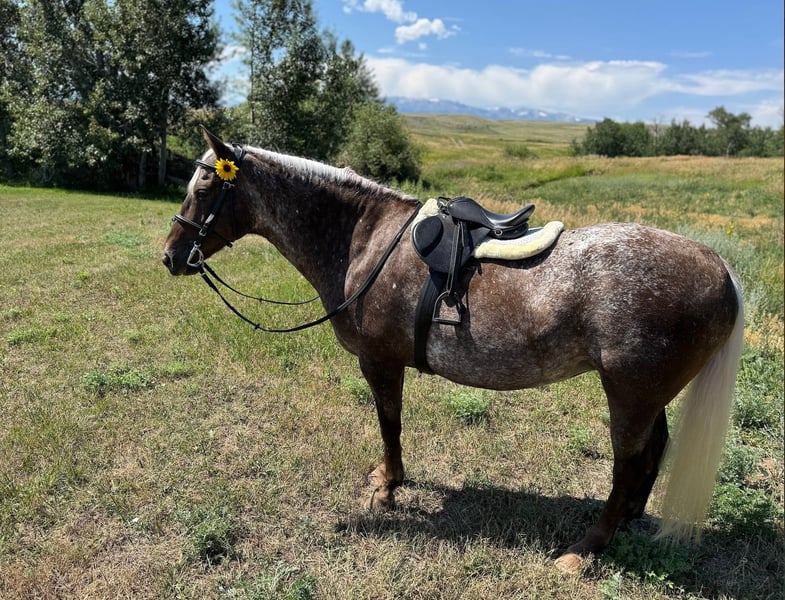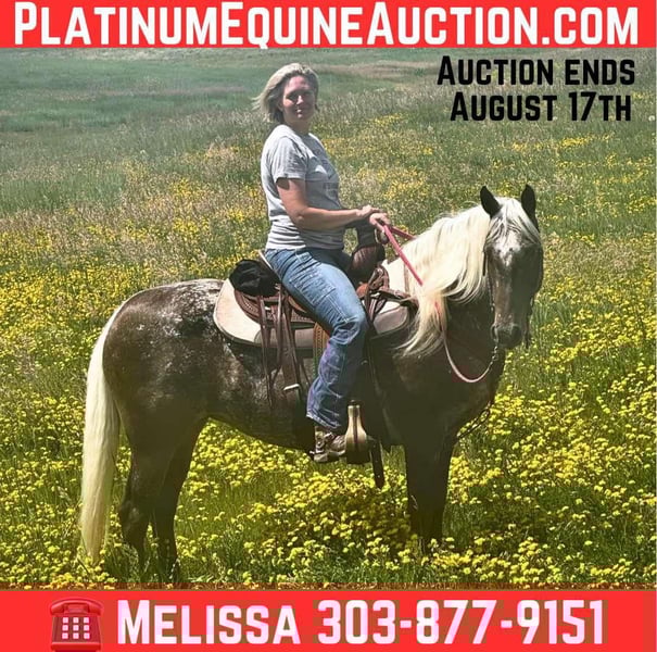 ONLINE AUCTION Place your bids at www.PlatinumEquineAuction.com Starting Bid $3500 Auction ends August 17th, 2025 Need a new saddle? Check out White Rock Saddles on our website or Facebook Curvy young blonde, loves adventure and long walks, seeking like-minded life partner… Here is a horse of a different color! Donna is an 8-year-old chocolate palomino roan mare, with curves in all the right places, and a temperament as sweet as honey. Donna stands 14.3 hands and is about 1100 pounds, with tons of foot and bone. She’s built to go anywhere and last forever. She sells grade, and your guess is as good as mind on her breeding; with big round feet and feathers, I suspect she’s a crossbred, but she’s sensitive to pressure and moves off the leg like a Quarter Horse, and that mane and tail are 100% Gypsy. Throw in some Appaloosa speckles or maybe Rocky Mountain Horse coloring, and she’s a real Heinz 57. Donna has impeccable ground manners. She bathes, clips, loads, ties, and is great with her feet. She was originally started in an English discipline, so she has some nice collection and the smoothest transitions you’ll ever feel. Then she got a job at a dude ranch, where she primarily worked in the children’s lesson program. She is an absolute angel with children, sweet and patient, and oh-so-forgiving. She has been exposed to tarps, dogs, goats, chickens, cattle, four-wheelers and all the chaos that comes with kids. Far from a deadhead, she’ll lope right off and pick up the pace when asked. In the arena, Donna knows both her leads and lopes pretty circles. She has a soft jog you can sit all day, and a gentle rocking-chair lope that’s sure to have you grinning from ear to ear. But outside of the arena is where Donna really shines. She LOVES a trail ride, and strides right out at a nice clip. She’ll lead, follow, and is happy to go out alone. Hop on her bareback to go check the cattle, or load her up for an overnight adventure with friends. She’s just happy to get out in the sunshine with you. Donna is 100% sound and sane, with no vices. She stays pleasantly plump on grass, and doesn’t have any blemishes. She’s up to date on shots, wormer, teeth, and feet. She has only ever known good care. She was barefoot all year, but I just got her shod all the way around for her sale. She’s legged up and ready to meet that special someone! Is it you? Located in Fishtail, Montana. Not available for private sale outside of this auction. Contact Melissa Kepler for more information: 303-877-9151. ONLINE AUCTION Place your bids at www.PlatinumEquineAuction.com Starting Bid $3500 Auction ends August 17th, 2025 Need a new saddle? Check out White Rock Saddles on our website or Facebook
