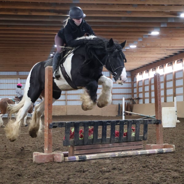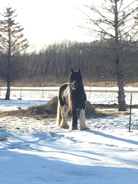 ♦️𝐍𝐄𝐖 𝐘𝐄𝐀𝐑'𝐒 𝑬𝒙𝒕𝒓𝒂𝒗𝒂𝒈𝒂𝒏𝒛𝒂♦️ Happening now thru MONDAY | JANUARY 12th - Available EXCLUSIVELY on HorseBid's website! For more details and to register visit: www.Horsebid.com CONSIGNOR CONTACT: Blackstone Stables 248-390-6831 LOCATION: Howell, MI BREED: Gypsy Vanner REGISTERED: No REGISTERED NAME: Pudge COLOR: Black and White Paint HEIGHT: 15.1 AGE: 10 GENDER: Gelding He's checking in at a solid made 15.1hh. He's a stunning black and white 12 year old gypsy vanner gelding. We are happy to introduce "Titanium's Pride" or pudge as we call him at home. His round figure and puppy dog demeanor are how he's earned his name. He has seen many miles on the trails from AZ to OR to MI and has proven himself to be a trustworthy trailblazer. Pudge has he’s got hair for days - a forelock that falls past his nose, a thick and naturally wavey mane that falls past his shoulders, a perfect tail that hits the ground and perfect feathering on all 4 legs. He looks like a picture in a magazine. His looks and conformation are no suprise as he has Tieg, The Lion King and The lion Queen on his papers. We are selling him as grade as he came with just a photo copy of his bloodlines. We have included a few baby photos of him 🙂. We are working on obtaining the original paperwork. Pudge is as kind-hearted as he is eye-catching. He truly loves his people, always the first to meet you at the gate and the last to leave your side — a true puppy-dog type. Gentle, mannerly, and calm whether you’re on the ground or in the saddle, he’s the kind you can trust every single ride. Ride him western, English, or bareback — he’s as comfortable as your living room couch and always a pleasure to ride. Pudge is steady, no-nonsense, and endlessly reliable. He’s spent time on a large working ranch checking fences, gathering cattle, and ponying colts. He has seen the rocky Arizona mountains, the deep woods of Michigan and the trails of Oregon. He will cross water, bridges, brush and ride down main roads. He is not one to notice wildlife, from elk, deer, coyotes, and birds he will remain as steady as they come. Pudge will ride out alone with plenty of confidence but will also join others in a group. Pudge has been in parades, carried the flag and has been to town. He is noticed wherever you take him and will gladly accept attention from anyone who wants to say hi. In the arena he is smooth and steady. He has 3 solid gaits, effortless transitions while being more whoa than go. He will steep right into the canter and take both leads. He also has beautiful flying changes! Pudge will stand anywhere you ask him for mounting dismounting or just in general. He is great for clipping, bathing, grooming and tacking. He's the type that can sit I the pasture and go to work once a month or every day with out issues. Pudge has been jumping around and he is fantastic at it! He's very brave to the jumps. He loads and hauls like a pro! He can live in or out and will play well with his equine buddies!Whether you’re looking for a dependable ranch horse, a safe and comfortable trail partner, a hunter type or simply a best friend Pudge is your guy.