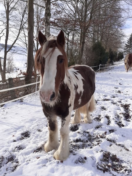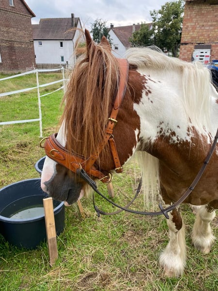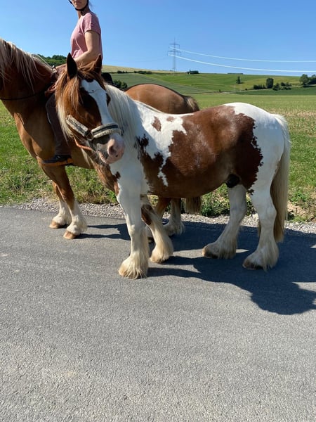 Verkaufe Tinker-Wallach – Perfekt für die Freizeit! Zum Verkauf steht ein hübscher Tinker-Wallach, geboren im Jahr 2011. Er ist ein wunderschöner Schecke mit langer Mähne und vollem Schweif. Er hat ein Stockmaß von ca. 134 cm und eignet sich ideal für den Freizeitbereich. Bei seiner Größe kann er von leichten kleineren Erwachsenen und Kindern geritten werden. Der liebevolle und freundliche Charakter macht ihn zu einem treuen Begleiter für alle, die die Natur und das Reiten in entspannter Atmosphäre genießen möchten. Der Wallach ist gut ausgebildet und besitzt ein sehr angenehmes ruhiges Temperament. Aufgrund seiner freundlichen Art ist er sowohl für erfahrene Reiter als auch für Einsteiger geeignet. Er trägt auch Kinder zuverlässig. Ideal für ihn ist Pferde- oder Ponygesellschaft. Er ist eher rangniedrig, mag andere Pferde und läuft am liebsten in der Gruppe oder mit einem Pferdekumpel. Aktuell läuft der kleine Tinker hauptsächlich als Führpferdchen mit. Das macht er sehr brav in allen drei Gangarten. Er geht am liebsten ins Gelände. Kennt aber auch Schulbetrieb. Er ist regelmäßig geimpft und entwurmt. Er reagiert auf Staub und steht am besten entweder im Offenstall oder in einem luftigen Stall auf Strohstrukturpellets oder Spänen. Er bekommt gutes Heu im Netz, das kurz angefeuchtet wird. Er kann mit Zubehör: Reitpad mit Satteldecke, Trense, Sidepull, Abschwitzdecke, Putzzeug abgegeben werden. Bei Interesse oder für weitere Informationen stehe ich gerne zur Verfügung. Vereinbaren Sie einen Termin für eine Besichtigung und überzeugen Sie sich selbst von diesem freundlichen Freizeitpferd!
