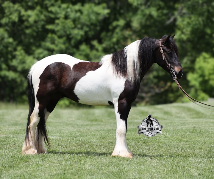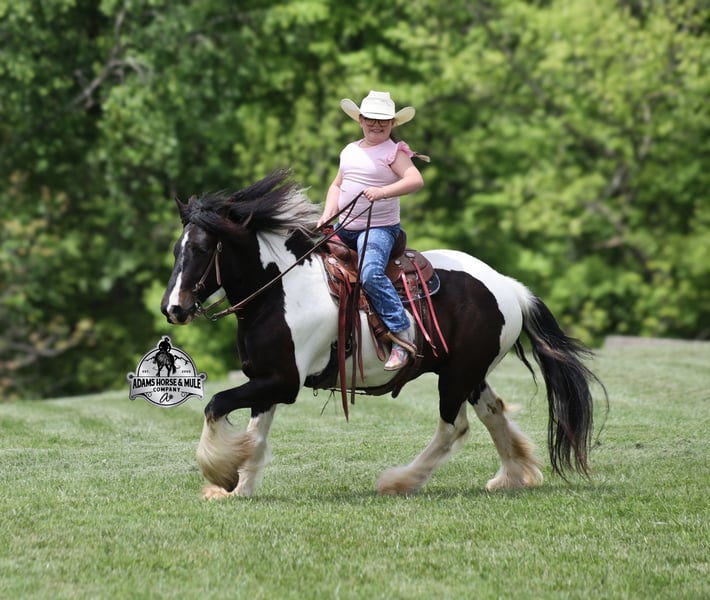 Meet Domino! This fancy looking Black Tobiano Gypsy Cross Gelding stands 14H and he is stocky built, he is 4 years old but its wise beyond his years! Domino has completed the natural horsemanship program and he is very friendly and loves attention!! He knows some tricks as well as he will lay down. Domino has done it all from being ridden by small children down the highways to being ridden around the ranch, pasture roped cows, rode fences and cruised the trails. Domino is confident out riding alone and does fine in groups. When out on the ranch or going down the trails he will cross creeks, ditches, logs and navigate rough, rocky areas. He is safe in traffic safe whether that be trucks or cars. He walks out easily, has a nice jog, his lope is slow and collected plus he lopes very nice circles! He has been exposed to all kinds of wildlife such as deer or turkey. He is athletic and would be a great horse to put under English tack to go over the rails with. He pastures well with others and rides the same after time off. Domino is a fun horse to ride and is sure to be everyone’s favorite! Feel free to call Eric 606-308-2461 with any questions! Go to visit our website for more pics and a video www.AdamsHorseAndMuleCo.com AHAMC has been in the horse business and sold horses over the internet since 2005. We have a long track record of success with hundreds of happy customers. We work hard to match riders with the correct horses and specialize in beginner safe, family friendly horses that have been used and checked out by our family! We can set up transportation anywhere in the US and look forward to working with you.