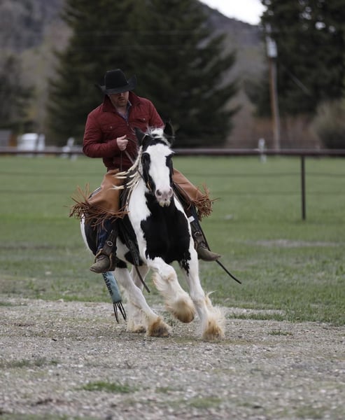 Are you looking for a young, athletic, big boned Gypsy Vanner with great structure and bone? If so, then Axel is your guy. He stands 14H tall and wide. He has all the potential in the world. He is so willing and eager to learn anything you throw his way. Axel has been ridden through just about every obstacle and atmosphere you could possibly imagine. From riding through bison, loading semis with cattle, rough trails, and even parades with all the loud music and floats, Axel takes it all with a grain of salt. Axel has been an “in your pocket” type horse since he was a weanling, wherever you’re at or whatever you’re doing, he wants to be right there with you. He is very low in the pecking order and would rather be right by your side than in the field playing with other horses. Axel is a very thick made gelding that has more whoa than go and would make an exceptional kid’s horse. He rides off your legs and seat so much that you can pull your bridle off and enjoy your day on his back with nothing on his head or neck. When it comes to loading and hauling Axel is a pro, no matter if you’re in a slant load trailer at a show or a stock trailer in the middle of the pasture, Axel will load himself into trailers amazingly. He is truly a stunning, young gelding with a heart full of kindness and a mindset the whole world should have. So, if you are looking for your next lifelong partner that loves attention, easy to be around, eager to please and just an all-around exceptional young gelding