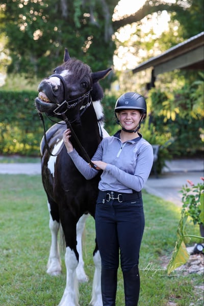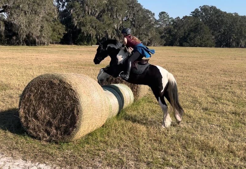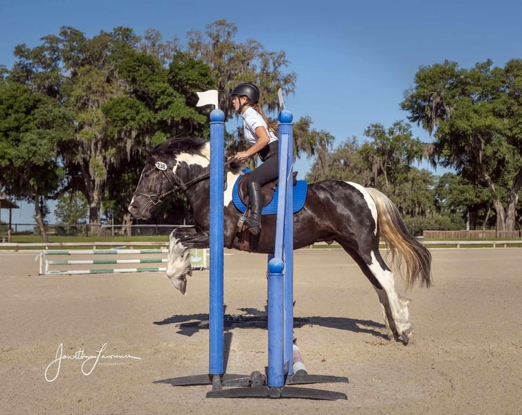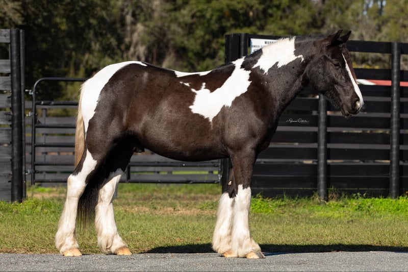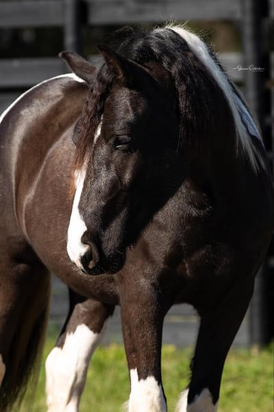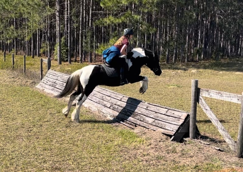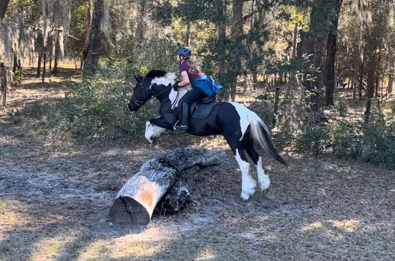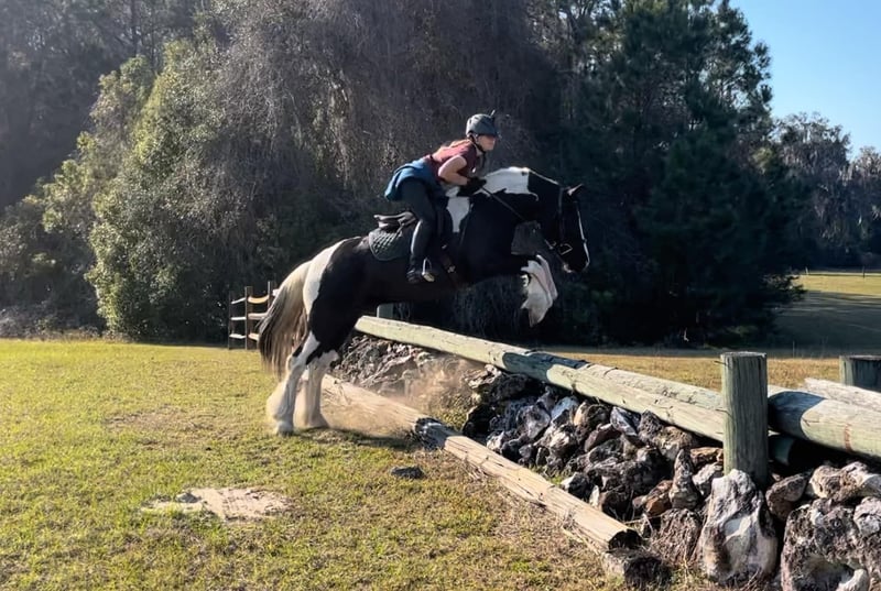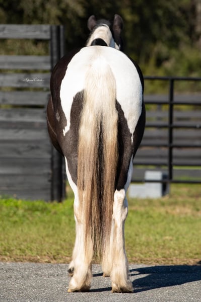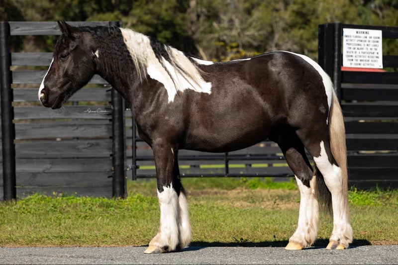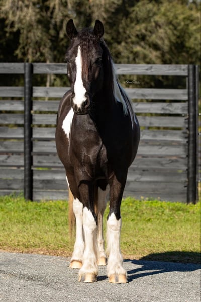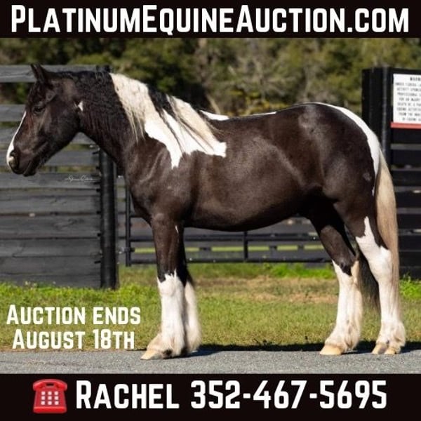 ONLINE AUCTION Place your bids at www.PlatinumEquineAuction.com Starting Bid $3500 Auction ends August 18th, 2024 Need a new saddle? Check out White Rock Saddles on our website or Facebook! Introducing Duke! The safest, sweetest horse, perfect for the whole family. Watch both of Duke’s videos to see everything he does – cross country, H/J, hunter paces, fox hunting, dressage, trail riding, western trail obstacle, beach riding, and more! It is so rare to find a dream horse like Duke. He is comfortable to ride, has the best brain, and is quiet enough for beginners and kids to ride. At 14.1h, he is a good size for children and adults. Duke is a cross between Gypsy Vanner and American Cream Draft. (I also trained and sold his PSSM-negative purebred Gypsy Vanner sire A Lucky Charm here on Platinum). Duke rides English and western. He schools training/1st level dressage, jumps around a 2’3” H/J course, and schools starter/BN cross country. He will hunt in any flight and could even make a nice staff/whip horse. At 5 years old, Duke has had a well-rounded education under saddle and could go in any direction. He is friendly and loves to work and learn new things. He is one of the horses at the farm that I allow guests and beginners to ride because I know he will take care of them. Duke is the perfect amount of whoa and go. He can sit for weeks and still be the same horse to ride. Easy for loading, hauling, tying, clipping, tacking, braiding, etc. He is a barefoot easy keeper with no vices or maintenance. I have done all of his training since halter breaking when I got him from his breeder. Duke had a photoshoot for Young Rider magazine and will be featured in an upcoming article! Don’t miss out on this once-in-a-lifetime super star!!! Please call Rachel with Show Me Sport Horses at 352-467-5695 with any questions about dream horse Duke! He is located in Ocala, Florida. Shipping can be arranged anywhere in the country. ONLINE AUCTION Place your bids at www.PlatinumEquineAuction.com Starting Bid $3500 Auction ends August 18th, 2024 Need a new saddle? Check out White Rock Saddles on our website or Facebook!