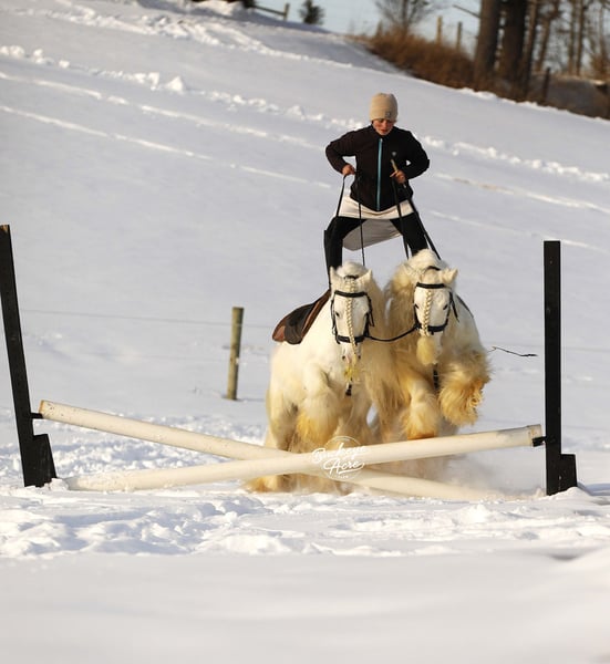 Wenn Märchenpferde Wirklichkeit wären, stünden Vanilla & Cream direkt vor Ihnen. Dieses atemberaubende Paar irischer Cob-Geldings ist wahrlich einzigartig, verbindet beeindruckende Schönheit mit echtem Erfahrungsschatz und außergewöhnlicher Vielseitigkeit. Schneeweiß mit langen, wallenden, flauschigen Mähnen und Schweifen ziehen sie garantiert alle Blicke auf sich und erobern Herzen im Handumdrehen. Diese 2018 geborenen Geldings sind herausragende Individuen, die auch als eingespieltes Paar glänzen. Vanilla ist 12,3 Hand groß, Cream misst 13 Hand – somit sind sie in Größe und Ausstrahlung nahezu perfekt aufeinander abgestimmt. Sie reiten Western, Englisch und Barhuf, ziehen Kutsche, passen mühelos seitwärts, und sogar Romanreiten wird mit ihnen geübt, was ihre Balance, ihr Vertrauen und ihren beeindruckenden Geist unter Beweis stellt. Ob im Dressurviereck, auf dem Trail oder in der Stadt – Vanilla & Cream treten selbstbewusst auf und bleiben stets zuverlässig. Sie haben bereits in der Stadt, auf belebten Landstraßen und im dichten Stop-and-Go-Verkehr ihre Ruhe bewahrt. Paraden, Ponyparaden, Menschenmengen, Lärm und Aufregung sind für die beiden nur ein weiterer Tag im Büro. Bei unserem örtlichen Umzug waren sie professionell, souverän und bei den Zuschauern äußerst beliebt. Vanilla & Cream stammen aus Irland, was ihre Seltenheit und ihren Wert zusätzlich steigert. Sie sind für jeden Reiter- oder Fahrniveau geeignet und haben eine echte „Ich-möchte-dein-Freund-sein“-Einstellung. Im Stall, in der Waschbox und beim Hufschmied sind sie unkompliziert, respektvoll und angenehm im Umgang – oft sind sie die Ersten, die an der Pforte auf Sie warten. Auf dem Trail sind sie entspannt, ruhig und ausgeglichen, stets bereit, aufzubrechen und Neues zu entdecken. Beide Geldings sind ehrlich, zuverlässig und genießen es, eine Aufgabe zu haben. Sie sind auf dem neuesten Stand bei Impfungen, Entwurmung und Hufpflege und somit bereit, in ihr neues Zuhause umzuziehen. Wenn Sie nach etwas suchen, das sonst niemand hat – nicht einmal Ihr Nachbar –, glauben wir ehrlich, dass Vanilla & Cream genau das sein könnten. Ein seltenes, umwerfendes Paar wie dieses gibt es nicht alle Tage. Für weitere Informationen wenden Sie sich bitte an Duane unter 330-231-2324 oder vereinbaren Sie einen Termin, um sie persönlich zu sehen. Wir würden uns freuen, Sie willkommen zu heißen und Ihnen eine Probefahrt zu ermöglichen.
