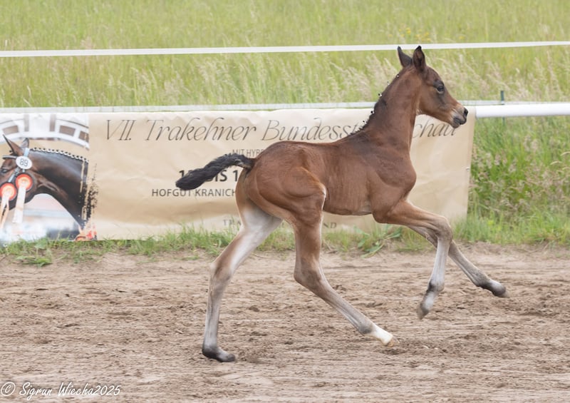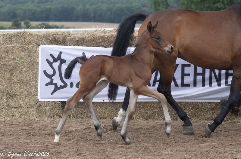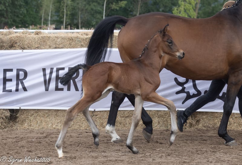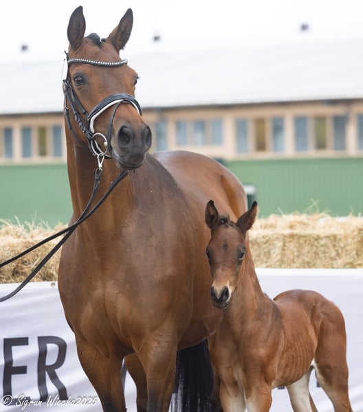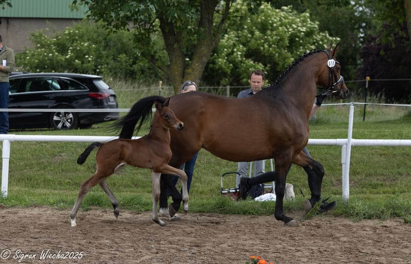 The exceptionally well-bred sire achieved a very good performance test and made a remarkable debut as a stallion: His first foals appear noble, with strong gaits, great dynamics, and impressive athletic presence. Equally well-bred is his son from the highly decorated Nachtlerche, one of the particularly impressive daughters of the crowd-pleaser Interconti. With Kentucky, Shavalou, Interconti, and Tambour, he is connected to rather rarely represented but increasingly popular documented riding horse sires. Rideability and willingness to work are therefore guaranteed, as well as a flawless temperament, since the Nachtlerche son comes from a well-cared-for home and has unlimited trust in the people who care for him.
