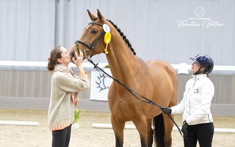 Night Temple by Tempelhof x Interconti, out of the distinguished mare St.Pr. and Pr. St. Nachtfürstin (T17C1a Nakita - Söchtig-Elmarshausen), presents himself as a powerful, completely clear-headed, well-mannered, and sportily ambitious competition partner with all the potential. His dam is the sister to the highly sought-after auction star Pr. St. Namika and represents a maternal dynasty that embodies both top-level hippological breeding and innovative breeding philosophy. The unforgettable granddam was already regarded as an breeding institution beyond the borders of her home stud Elmarshausen and produced, among other achievements, the licensed stallion Nachtruf and no less than seven daughters, some with double premiums, including the successful M-level dressage horse Nuschka (ex Nachtmusik). Night Temple is the first licensed son of his sire, Tempelhof. Night Temple himself is licensed, has already completed the performance test, and has also proven himself successfully in competition. In three show starts, he always placed among the top three horses. At three years old, he earned a silver medal in the young horse championship's dressage test and a bronze in the final. At four, he achieved first place in his debut jumping competition. Night Temple is always fully focused and attentive to his rider. In the foreign rider test, he received top marks with a score of 8.5. He is easily handled by ladies and demonstrates absolute reliability and good manners in handling. We see Night Temple both in high-level sport and in breeding. An ultrasound examination with crystal-clear X-ray images is available. Night Temple has been examined multiple times for licensing and performance testing and is absolutely healthy.