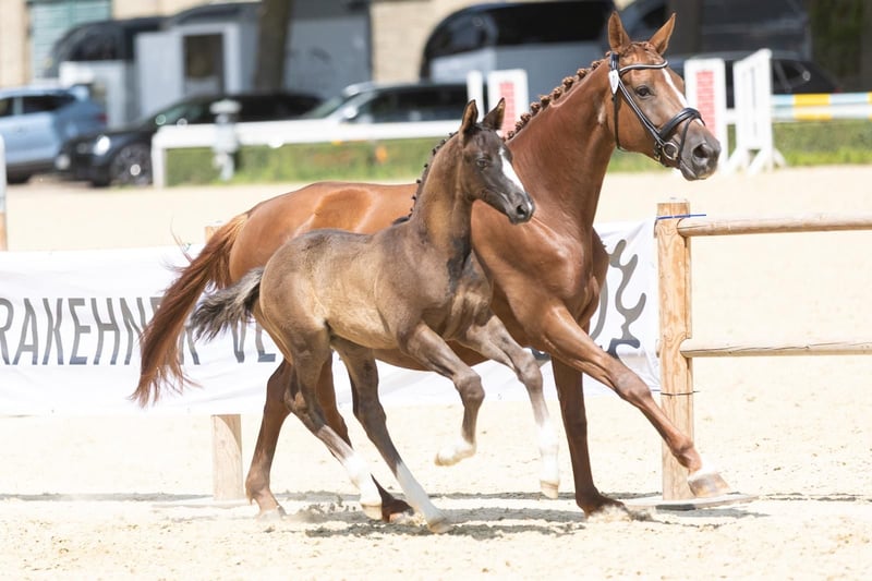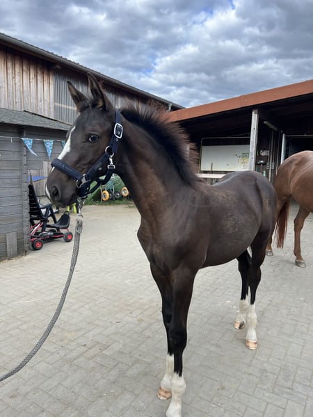 For sale is this striking colt, born in April 2025. He is sired by Hirtenstern out of a Herzog von Nassau x Peron mare. This little gentleman is a real eye-catcher – with a dark coat, evenly white socks, and a beautiful blaze. He is very alert, completely fearless, and loves being groomed. His charming personality captivates everyone. The estimated final height is around 1.70 meters or taller. He is of large frame and has a solid foundation. At the foal show, he received ratings in the 8s for both type and conformation. Transport within Germany is possible. If interested, we look forward to hearing from you. Additional photos and videos are available and can be sent upon request. The rearing place can be taken over. Transport within Germany is possible.