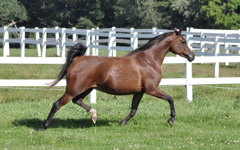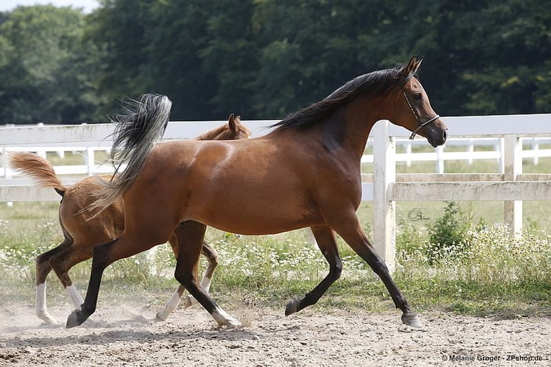 Solo a causa della cessazione della pura allevamento di purosangue arabi, cediamo questa ultima fattrice in mani rispettose. Valutata e premiata nel VZAP, non è ancora registrata nel Verband Trakehner. È una figlia del multichampion Bolero EM e della fattrice Elite e Trakehner GP Qair un Nissa, figlia del campione del mondo Kubinec. Ha un ottimo sangue prevalentemente russo/spagnolo. Qapuera è estremamente tipica, con movimenti potenti e un corpo eccellente e una buona struttura. Ha avuto tre puledre premiate. Una delle sue figlie - Camar Cadiz da Pechaton ox - ha prodotto quest'anno un puledro campione altamente valutato dal Trakehner Painters Maxim, che ha vinto il ring dei puledri di sangue speciale al campionato di Graditz. Qapuera ha quest'anno una bellissima puledra premiata dal cavallo Elite Arian Shah ox al suo fianco, che è anche approvato nel Verband Trakehner e padre, tra gli altri, del cavallo approvato Bahrain. Anche questa puledra è in vendita. Qapuera è gentile nel maneggio, a volte un po' nervosa e può tessere un po' sotto stress. Non morde, non calcia, ecc. Conosce il pascolo 24 ore su 24 in estate e box/paddock in inverno. Non è dominante nel branco. Nessun comportamento scorretto in stalla. Conosce l'inssemmazione, l'ecografia, ecc. Non è adatta per l'irrequietezza di un grande maneggio. Saremmo felici se qualcuno decidesse di includere questa bellissima fattrice nel proprio programma di allevamento.
