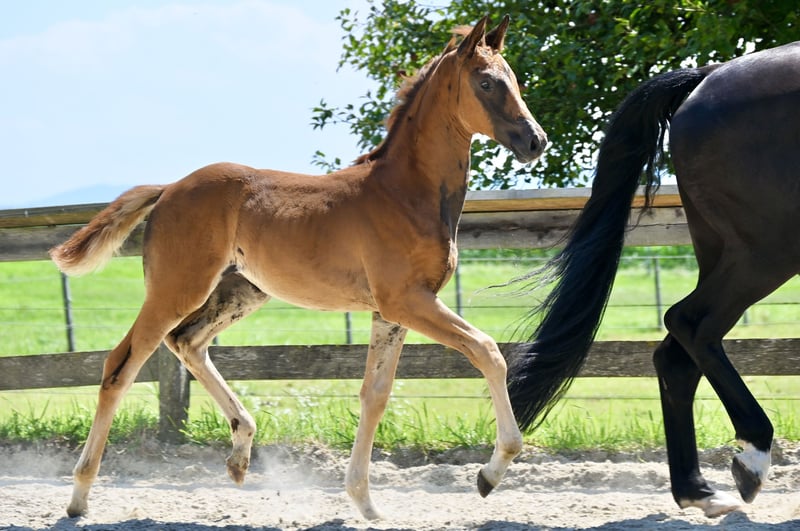 Salome's daughter by Grand Prix-successful Zauberdeyk is also an aspirant for a brilliant career from a sporting point of view. She is also exquisitely bred, as her highly proven sire has been highly successful both in demanding eventing championships and subsequently in the big dressage arena up to Grand Prix level. On her dam's side, there is the reserve champion All Inclusive with numerous great successes up to and including Grand Prix level and, finally, Herzruf, a documented performance sire. A filly that proved to be worthy of this exquisite bloodline on the occasion of her evaluation: Highest nobility and concise breed type (9.0!), large, significant body parts (8.5!), excellently developed and with the best growth. And she also scored highly in her basic gaits - with plenty of rhythm, great scope, elevated and light-footed in equal measure. A top foal of great importance, in keeping with her distinguished pedigree! Closely related to the licensed Sinatra, who is heading for a sensational career in dressage in master hands on the British Isles. From a mare line rich in tradition, which has been successfully cultivated in this breeder's house for generations and has its roots in the bay herd of the main Trakehnen stud, namely in Kalpakin.