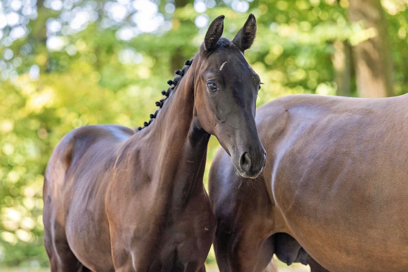 A well-thought-out pairing with a successful outcome, this show jumping-oriented filly boasts an attractive dark coat. She is comfortably built, with a long neck and a good topline. Still in growth, she has plenty of leg and a modern, athletic silhouette. It is already evident that the foal will surpass its dam in both frame and size. The combination of Arizonas x Phlox is characterized by great desirability and genetic reliability. As a son of the legendary parcours hero Almox Prints, Arizonas possesses top-quality jumping ability himself, and the well-bred damline mare, Phlox, was also successful in show jumping up to S level. Here, true performance is developing.