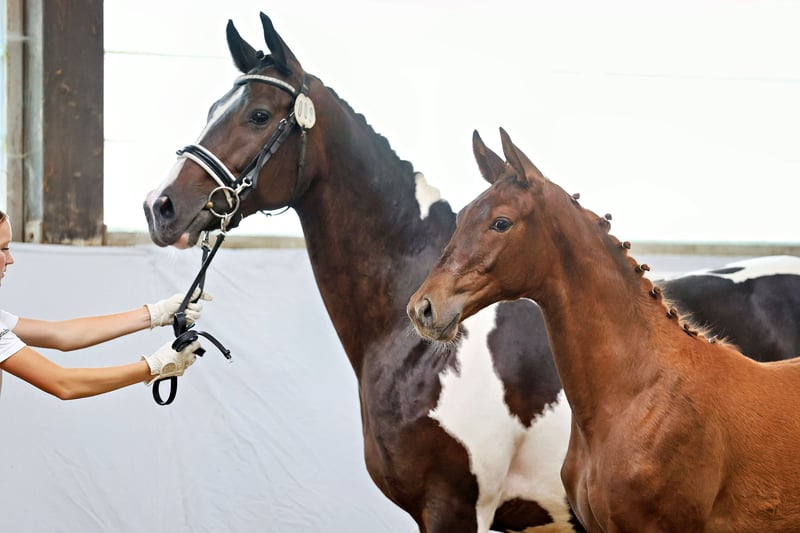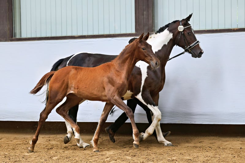 His sire Grenoble is a true crowd-pleaser—not only because of his aesthetically pleasing pinto markings but also due to his top-class rideability. Recently exported to the USA, he now aims for a successful career in the demanding hunter discipline. It is hard to believe, but RW impresses with an excellent temperament and consistently demonstrates a high level of athleticism, combined with a typy and feminine appearance, as well as harmonious conformation and expressive, rhythmical movements marked by tact and clarity. His dam is among the best daughters of the pinto stallion Camaro, who proved his worth in challenging eventing competitions and was also regarded as a crowd favorite thanks to his excellent character and outstanding rideability. On the maternal side, he descends from the S-dressage successful premium stallion Lowelas (Canada) and the legendary dam line of the main stud farm’s distinguished mare Kokette by Cancara.