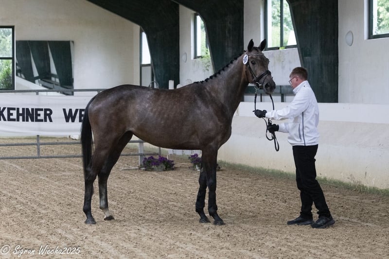 This 4-year-old grey mare boasts an impressive pedigree featuring top-tier eventing bloodlines, including Asagao xx, Duke of Hearts xx, Puschkin ShA, and Parforce. She is equipped with three good basic gaits. In free jumping, she impresses with good bascule, scope, and talent. She is a well-built horse standing approximately 1.65 meters (16.1 hh), with an expected final height of around 1.68 to 1.70 meters. In handling, she is uncomplicated, affectionate, and confident. Her outstanding ancestry and her own talent make her particularly suitable for eventing. The mare has been backed and is already competing over small courses. She has an impeccable character and is a very sweet, people-oriented horse. Current good X-ray results are available. I am happy to send recent videos via email.