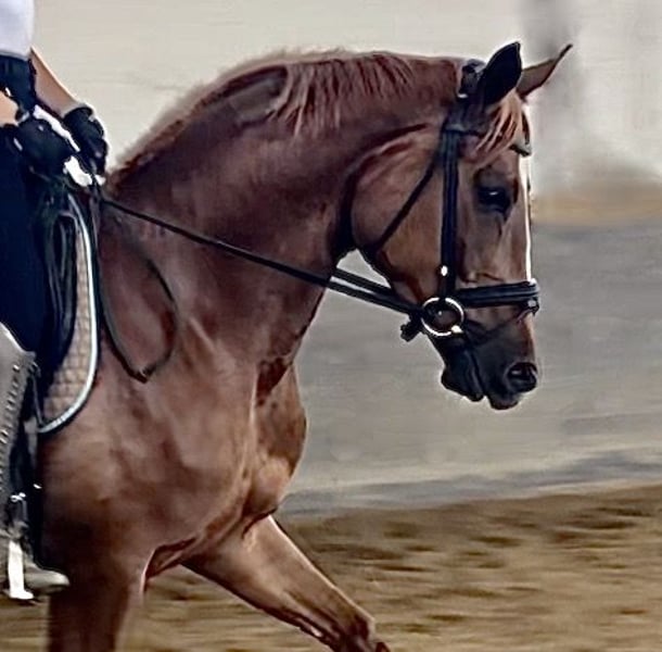 Hailey is a stunning, noble chestnut mare. In May/June 2024, she was lunged and introduced to the saddle and rider. Afterwards, she spent another year in the stable and on the pasture, as she was born late in the season. From July 2025, she was backed and started under saddle with the Bavarian Breeding Association in Munich-Riem. Impressions from the foreign rider test during her mare performance test (after 7 weeks of training!). See video! Performance test evaluations include: Character 10.0; Temperament 9.0; Willingness to perform 9.5; Conformation 9.0 Hailey is rideable (and comfortable to sit), friendly, and well-behaved. Health condition = top fit. X-ray images from August 26, 2025: no findings! Hailey’s pedigree: Sire: P.H. Karim Dorè (see attached picture – chestnut stallion) On her sire’s side, she descends from the Grand Prix dressage horses E.H. Imperio and E.H. Insterburg – the highest-rated Trakehner “Star” sires of 2025, ranked 1st and 2nd. Dam: St.Pr. and Pr.St. Hetidze v.H. (see attached picture – Rapp mare) On her dam’s side, the Trakehner stallions E.H. Monteverdi and Ibikus guarantee excellent riding horse qualities. Hailey’s very good general impression (see video at the longe line) continues to be developed – now under the rider. Hailey can be tested under saddle at any time. For inquiries and to arrange a viewing, please contact her rider and trainer, Kathrin Reisinger, at: +49 173 2732008.