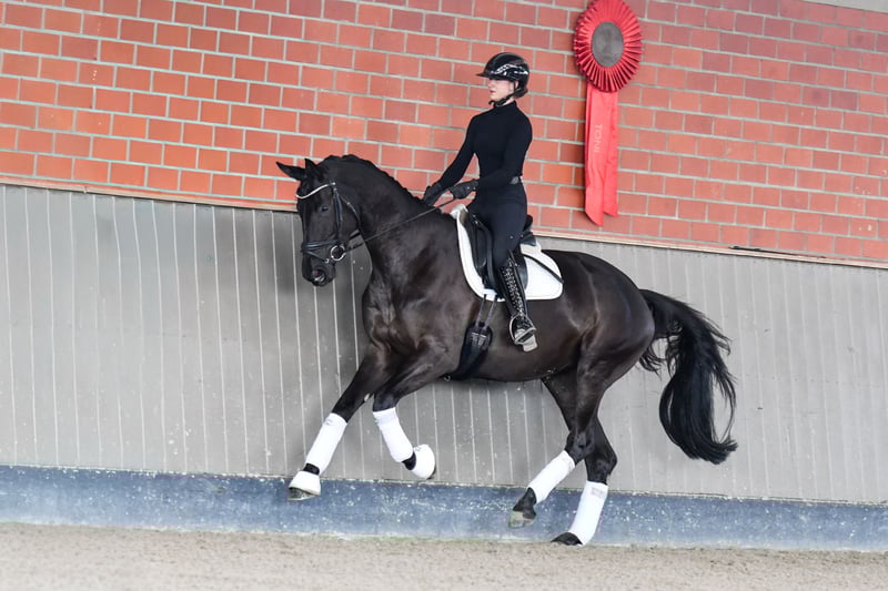 Diese ganz pompöse Rappstute mit Rahmen und Format füllt auch das große Viereck. Bei ungemein bedeutender Anlage des Körpers steht sie auf stabilem Fundament. Gut und lange gereift hat sie trotzdem noch viel Entwicklung vor sich. Reiterlich unkompliziert und ausgestattet mit einem Pedigree der Superlative: Vollschwester zum Siegerhengst Kaiser´s Erbe, Dreiviertelschwester zum Siegerhengst Kaiser Milton und dessen gekörtem Vollbruder Kavalli. Väterliche Halbschwester zu TSF Dalera BB und Millennium. Mutter Kaiser´s Els ist Vollschwester zu den beiden gekörten Grand-Prix-Hengsten Kaiserkult und Kaiserdom sowie deren Vollbruder Kaiseradler, der auch im fortgeschrittenen Alter noch bis Grand Prix erfolgreich ist. Diese Referenzen sind schwer zu überbieten. Ein aktueller TÜV inkl. Genick/Rücken/Hals ist vorhanden.