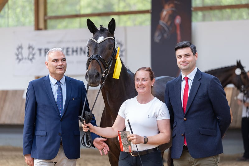 Hace pocas semanas, Hillery completó la inscripción central de yeguas y su prueba de rendimiento de manera ejemplar y con actuaciones seguras, obteniendo el resultado: ¡YEGUA PREMIADA! En la ocasión de la inscripción, destacó principalmente por su tipo y nobleza, una conformación corporal bien formada y armónica, buenas a base de pasos uniformes, especialmente un paso excelente, y además impresionó en su prueba de rendimiento con una evaluación sobresaliente de su aptitud para el salto. Por lo tanto, sigue el ejemplo de su madre Helena, quien fue evaluada con altas calificaciones y notas máximas en todos los criterios y también realizó una prueba de rendimiento de primera clase. Hillery es una de las pocas hijas del premiado semental de cría deportiva Grappa Nero. La línea materna ha sido cuidada en esta casa de cría durante generaciones y presenta, en la combinación de los sementales de buena monta Hohenstein y Latimer, exitosos en la pista de doma S, con el fundador de línea Arogno, una configuración de pedigrí de alto nivel tanto en lo deportivo como en lo criador.