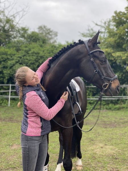 Toby ist ein 11-jähriger Wallach mit einem tollen Charakter und guter Grundausbildung. Im Umgang ist er stets brav, unkompliziert und freundlich – auch im Alltag ein stets freundlicher Partner. Er zeichnet sich durch seine Rittigkeit aus. Toby zeigt sich in der Dressur sicher bis zur Klasse L. Auf dem Turnier konnte er sich bereits mehrfach in L-Dressuren platzieren. Lektionen wie Außengalopp, einfache Wechsel oder Schulterherein beherrscht er zuverlässig. Seitengänge wie Traversalen und fliegende Wechsel zeigt er sicher. Im Springen hat er Turniererfahrung bis Klasse L. Auch im Gelände ist Toby routiniert und jagderfahren – dabei bleibt er ruhig und gut händelbar. Ich habe Toby Ende 4-jährig gekauft. Gemeinsam haben wir die ersten Geländepferdeprüfungen absolviert und uns auf CCI1* hochgearbeitet. Leider hat sich herausgestellt, dass sein Herz nicht 100%-ig für die Vielseitigkeit schlägt. Da ich mich jedoch in der Vielseitigkeit zuhause fühle, gebe ich ihn schweren Herzens ab. Toby eignet sich gut für Amateure mit sportlichen Ambitionen v.a. in der Dressur oder für jemanden, der ein gut ausgebildetes, vielseitiges Pferd sucht, mit dem man in verschiedenen Bereichen Spaß haben kann. Auch für Kinder und Jugendliche ist er geeignet.