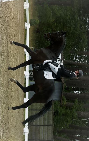 Toby is an 11-year-old gelding with a great character and good basic training. He is always well-behaved, uncomplicated, and friendly in handling – a consistently friendly partner in everyday life. He stands out for his rideability. Toby demonstrates confidence in dressage up to the L class. He reliably masters movements such as canter on the outside, simple changes, and shoulder-in. He shows lateral movements like travers and flying changes with assurance. In show jumping, he has competition experience up to the L class. Toby is also experienced in cross-country and hunting – he remains calm and manageable during these activities. I bought Toby when he was just 4 years old. Together, we completed our first cross-country horse trials and progressed to CCI1*. Unfortunately, it has become clear that his heart is not fully in eventing. However, since I feel at home in eventing, I am reluctantly letting him go. Toby is well-suited for amateurs with sporting ambitions, especially in dressage, or for someone looking for a well-trained, versatile horse to enjoy in various disciplines. He is also suitable for children and young riders.