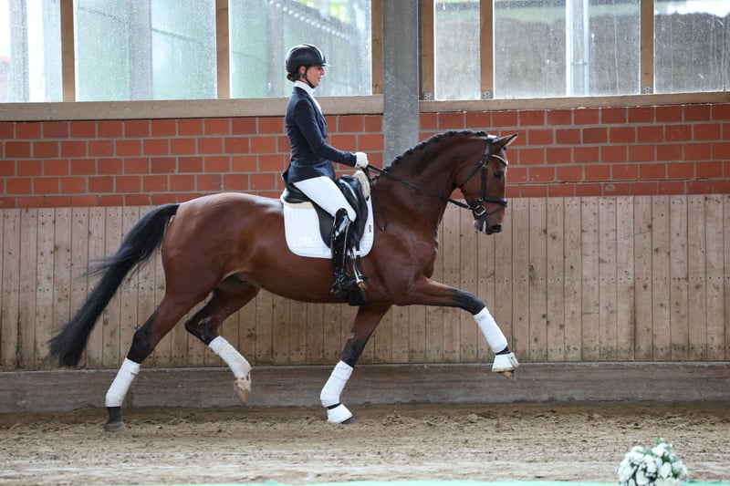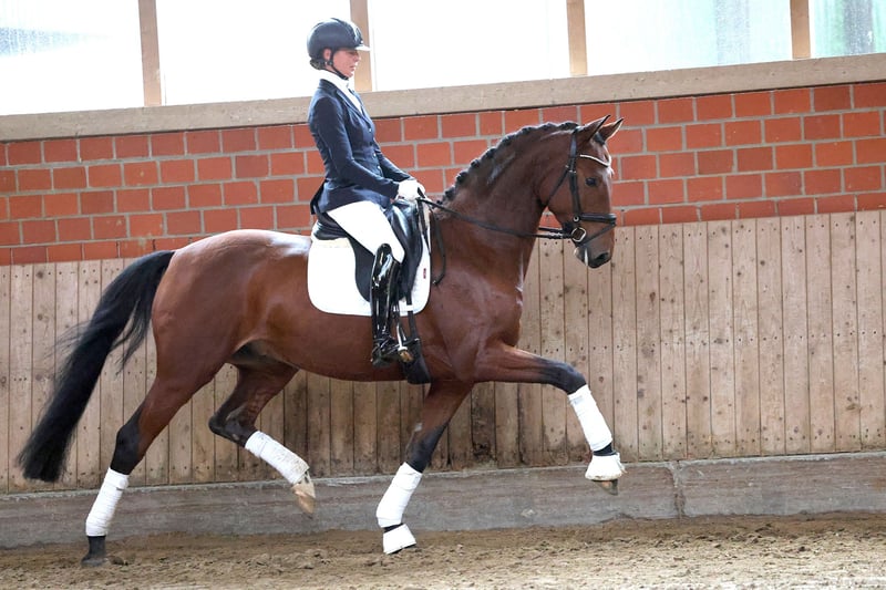 Sportlertyp mit Stil und Kultur im Leistungsprofil. Mit beeindruckender Kadenz und Übersetzung seiner Bewegungen ausgestattet, inszeniert hier eine Dressurkoryphäe vornehmster Sorte seinen Auftritt, dazu kam er im heimatlichen Stall in den Genuss bester reiterlicher Bildung. Siege und Platzierungen in Reitpferde- und Dressurpferdeprüfungen Klasse A sowie hochplatziert im Finale des Trakehner Reitpferdechampionats der Vierjährigen in Münster-Handorf. Weitere Informationen finden Sie unter: https://bid.trakehner.auction/auctions Sport horse model whose performance profile includes style and class. A dressage whizz of the most distinguished kind with impressive cadence and big movement makes his appearance. He has been exceptionally well trained under saddle at his home stable and knows how to capitalize on his training: He has won and placed in ridden and dressage horse classes and finished on a high placing in the Trakehner 4-yr-old riding horse championship in Münster-Handorf. Further information can be found under: https://bid.trakehner.auction/auctions