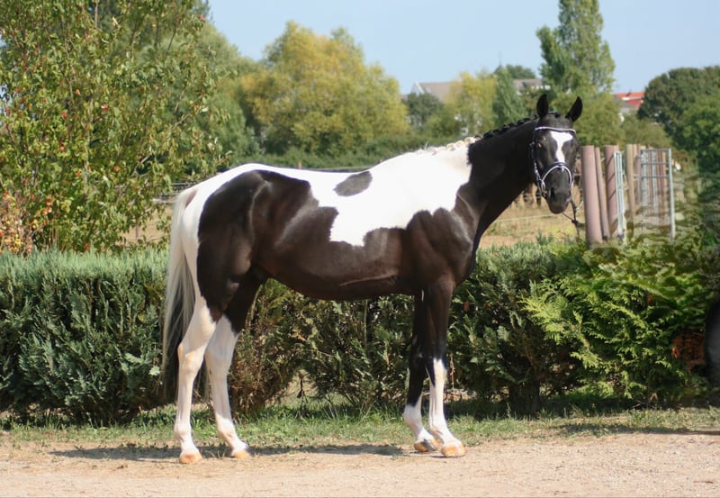 Ein besonderes Pferd mit der Perspektive für den Einsatz in Sport und Freizeit. Das ausgeglichene Interieur, die naturgegebene Rittigkeit und Leistungsbereitschaft machen diese sympathischen Youngster zu einem wahren Musterschüler. Der Vater dieses Sympathieträgers, der Hengst Donauabend, war selbst im Springparcours erfolgreich. Die mütterliche Linie dient als stabiler Grundstein für die Verlässlichkeit dieses Wallachs und brachte unter anderem auch die Vererber Elfenstein und Exclusiv hervor. Der auffällige Schecke absolviert bereits erste Sprünge unter dem Sattel und zeigt sich auch beim Überwinden kleinerer Geländesprünge bereits sehr motiviert.