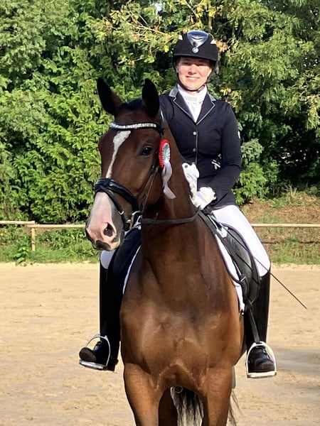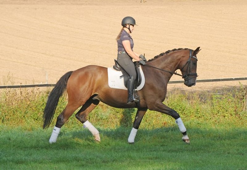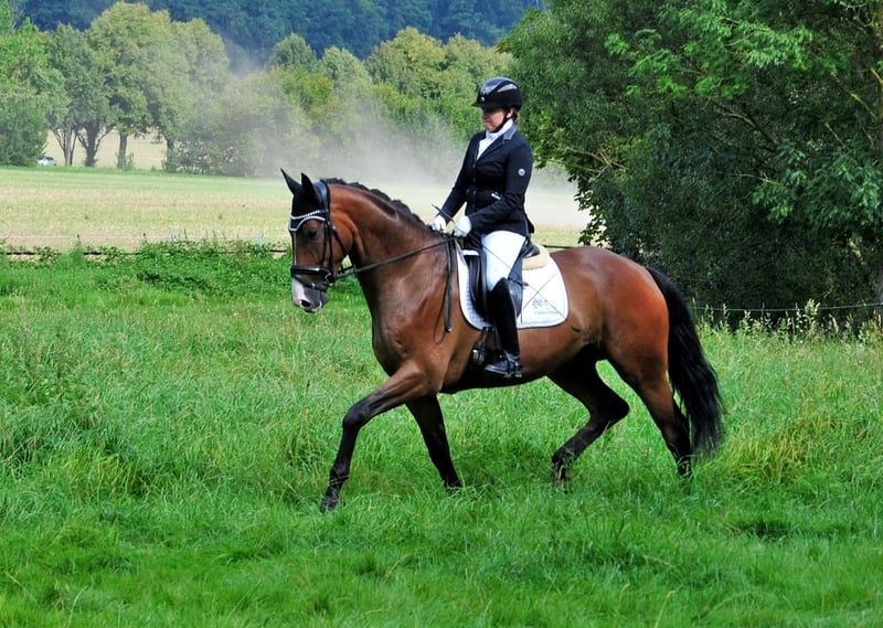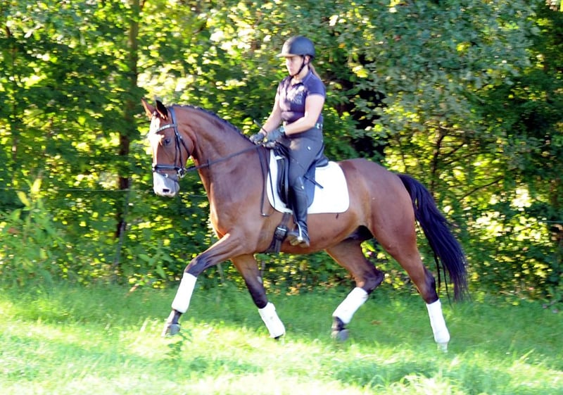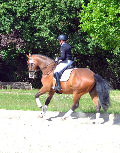 Der großrahmige Tom Taylor ist ein ganz bedeutend aufgemachtes Pferd mit erstklassigem Interieur und drei richtig guten Grundgangarten. Der Schritt ist imposant. Im Trab und Galopp sehr taktsicher, schwung- und kraftvoll! Aktuell : siegreich in Dressurpferdeprüfung - erfolgreich in Reitpferdeprüfungen! Er ist altersgemäß auf dem Weg in Richtung Kl. L. Wir wünschen uns für ihn einen gefühlvollen Reiter, der ihn dressurmäßig weiter fördert. Er ist ein Kandidat für das große Viereck! Tom Taylor liebt auch Ausritte und hat auch viel Freude am Freispringen! Er ist sehr Gruppen verträglich und insgesamt sehr freundlich zu Mensch und Pferd. Vater Zauberdeyk ist aktuell bis Grand Prix erfolgreich. Seine Mutter gewann ihre Stutenleistungsprüfung und brachte mit der 4jährigen Taluna eine Siegerin in Reitpferdeprüfung sowie Dressurpferde A erfolgreiche Tochter. Aus naher Verwandtschaft der M/S erfolgreichen Dressurpferde Thimur (Grand Prix), Taylord, Tausendsassa, Trocadero, Trezèguét, Tolkien ...