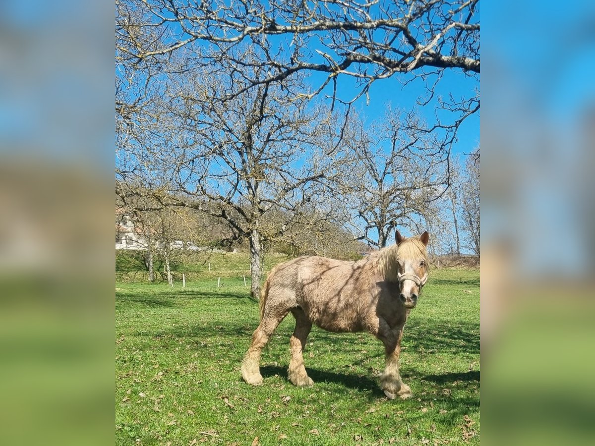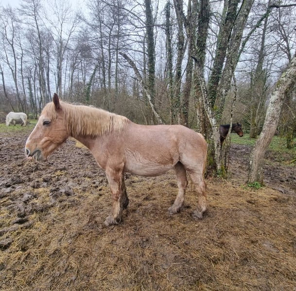 Bonjour je vend cette jument gestante d'un étalon comtois. Début de terme le 3 juillet. Jument douce elle a un léger voile sur un œil.