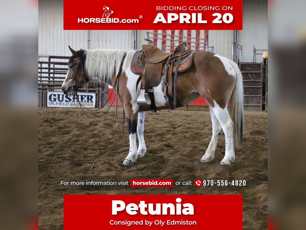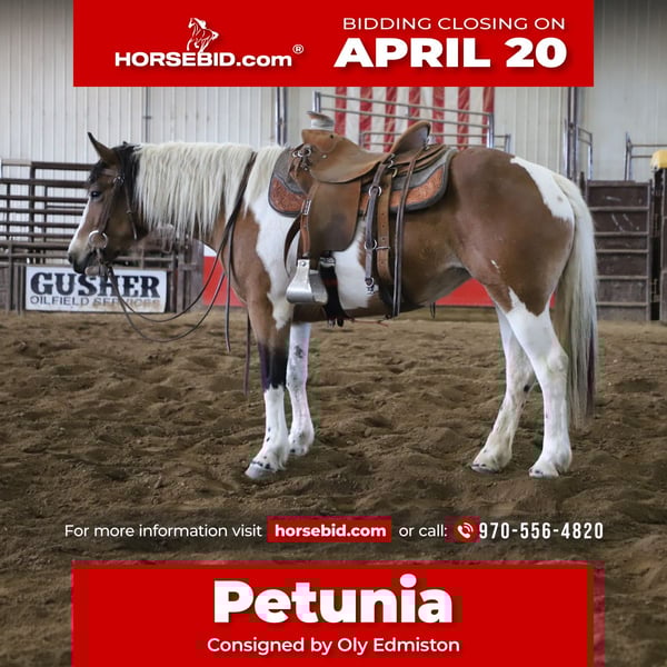 ⚜️𝐭𝐡𝐞 𝓔𝓵𝓲𝓽𝓮 𝐒𝐩𝐫𝐢𝐧𝐠 𝐂𝐥𝐚𝐬𝐬𝐢𝐜⚜️ Happening now thru MONDAY | APRIL 20th - Available EXCLUSIVELY on HorseBid's website! For more details and to register visit: www.Horsebid.com CONSIGNOR CONTACT: Oly Edmiston 970-556-4820 LOCATION: Nunn, CO BREED: Draft Cross REGISTERED: No REGISTERED NAME: Petunia COLOR: Bay and White HEIGHT: 14.1 AGE: 5 GENDER: Mare If you are looking for a trail partner, Petunia is your gal! Petunia is a solid trail horse... in the mountains, through town or out on the open prairie. She loves the water and will cross or hangout in the rivers, creeks, or ponds. Petunia is sure footed and crosses down timber and navigates off trail in brush, rocks and steep terrain. My 9 and 7 year old kids absolutely love her. They catch her on their own and ride her bareback around the corrals. We have used her moving cows and checking the calving pasture. Petunia has always been a trooper when it comes to new things. She is smart and learns quickly. Petunia is smooth in all gaits. She is heavy boned and thick. She'll work for a lot of riders. She absolutely loves attention and grooming. She is good to saddle and is vet and farrier approved. She loads easily in the trailer and backs out. Petunia comes with current spring vaccinations, deworming, and coggins. Call for more information or to schedule a time to meet Petunia at home in northern Colorado.