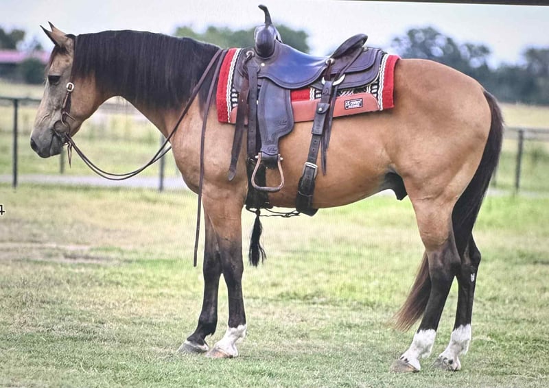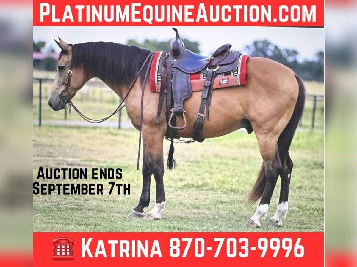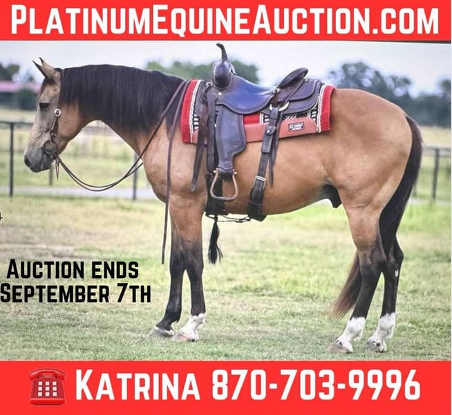 ONLINE AUCTION Place your bids at www.PlatinumEquineAuction.com Starting Bid $3500 Auction ends September 7th, 2025 Need a new saddle? Check out White Rock Saddles on our website or Facebook Sport is a grade, 9 year old, buckskin crossbred gelding standing exactly 15.1 hands tall on the stick. Talk about the ULTIMATE pleasure/trail horse!!!!! Sport will go anywhere you point his head to. Whether you’re wanting to ride the trails, do the parades and special events in town, ride through the cows at home or just cruise the country backroads, he’s your guy!!! He is supremely gentle with a ton of experience to back it up!!! ANYONE can ride this gelding and he isn’t one that has to be ridden frequently to be gentle. Ride him or stand him up and he will be the same horse everytime you go to ride him. He’s easy to catch anywhere you find him. He tacks up quietly each and every time. He bathes and fly sprays like a gentleman. He is mounting block broke. He loads/unloads with the best of them. In the front, lagging around in the back or square smack in the middle, you can ride him anywhere in a group on a trail ride or if you’re not comfortable with crowds, he rides out alone so you can take to the trails by yourself. He will tolerate a rope being swung off him or something leisure being pulled behind him. He doesn’t mind the cattle, dogs or other horses as he gets along great with any of them. You can also post the flag on him. Logs, creeks, bar ditches, curbs, culverts, Sport crosses all obstacles that is asked of him without balk. We’ve ridden this gelding everywhere in town, on the farm, through the wooded areas and just down the country roads! Ladies and gentlemen of all different ages have ridden him and gotten along fabulous with him! Contact us today to schedule a time to come meet Sport and take him for a test ride as you’re sure to love him as much as we do!!! For more info contact Katrina with Garner Land & Cattle Co. 870-703-9996 We are located in Arkadelphia, AR and can assist with transport anywhere in the US. ONLINE AUCTION Place your bids at www.PlatinumEquineAuction.com Starting Bid $3500 Auction ends September 7th, 2025 Need a new saddle? Check out White Rock Saddles on our website or Facebook