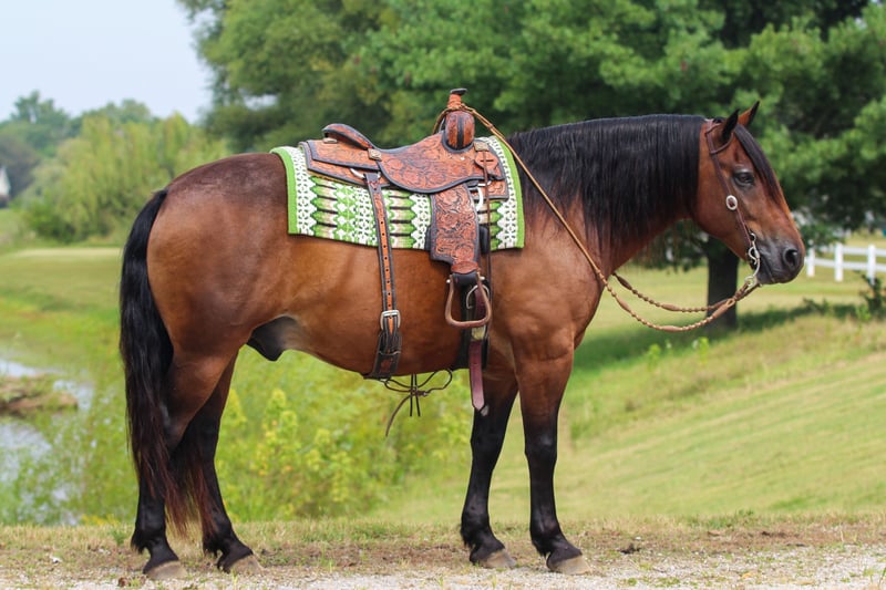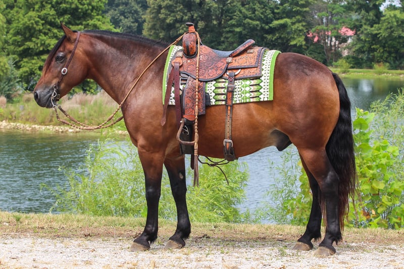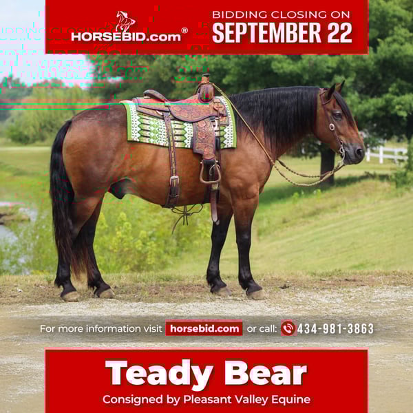 🍁𝒕𝒉𝒆 𝐅𝐀𝐋𝐋 𝑺𝒑𝒆𝒄𝒕𝒂𝒄𝒖𝒍𝒂𝒓🍁 Happening now thru MONDAY | SEPTEMBER 22nd - Available EXCLUSIVELY on HorseBid's website! For more details and to register visit: www.Horsebid.com CONSIGNOR CONTACT: Pleasant Valley Equine 434-981-3863 LOCATION: Robards, KY BREED: Draft Cross REGISTERED: No COLOR: Bay HEIGHT: 15.1 AGE: 9 GENDER: Gelding If you're looking for a dependable gelding to hit the trails with, work cattle, and maybe even start roping look no further. Let me introduce Bear. After you get to know him, he will remind you of a cuddly teddy 🧸 Bear is picture-perfect standing 15.1hh & 1300lbs. He is absolutely one of a kind. Bear has a beautiful, thick main and tail and loves to stand for hours to be brushed and braided. You will just fall in love with his great disposition. Bears HISTORY.... Bear was purchased from us 2 years ago. To be a part of a small therapeutic riding program in Chicago, Illinois. He is loved & adored. He was rode through flocks of sheep & milking cows. They spent lots of time working on dressage moves in their indoor. His owner has decided to get into Western Pleasure & wants to start showing. They must decrease their herd to make room. Before this, Bear lived in Tennessee on an exclusive trail riding resort where he packet well-known politicians in the arena & down the trail. Rider that has never rode before or seen a horse. There are not many Draft Cross that ride like this guy. He is more of a push style but will lope off from a stand still. He has a rocking chair lope and will jog slow and soft. Bear has a one hand neckrein, gets his leads, side pass, will do turnarounds, works a gate, is back soft, and he has a huge stop. He will ride away from the barn with no funny business, in big groups, or out alone. He’s seen all kinds of wildlife and spent many miles in the fields and woods. He will do all the trail obstacles with no hesitation and an absolute blast to ride. He is great for any level rider, young or old. Bear also rides english. He's started going over small jumps and seems to enjoy it. He spent the last couple of months working on his dressage moves. Bear has the best ground manners, is easy to catch in the field, and gets along with other horses. He stands for saddling, bathing, and for the farrier. Currently, Bear is barefoot and does not require shoes. He will kindly drop his head to make bridling easy. With just a snap of your finger, Bear will side pass to a picnic table, truck bed, log, or trailer fender to make mounting easy. He’s 100% sound with no vices and up to date on vaccinations. Check out Bear video and make an appointment today to meet him.