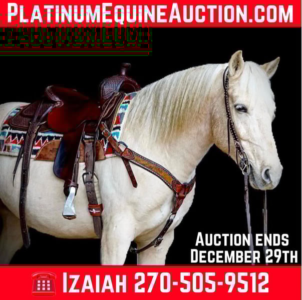 ONLINE AUCTION Place your bids at www.PlatinumEquineAuction.com Starting Bid $3500 Auction ends December 29th, 2024 Need a new saddle? Check out White Rock Saddles on our website or Facebook! Check out Phoenix! A 9 YEAR OLD PALOMINO CROSSBRED GELDING! This gelding stands around 15 hands tall and is wide as he is tall! This gelding has been a pleasure to have around! We have trail rode him all over he will cross the creeks and logs and has been to over night camping trips! Phoenix will take both leads and has been rode english and western! He will lead the trail ride or follow right along! He will stand for you to get on and off! He will run right up to you in the pasture and wants to be your Freind! He will pick up all four feet, loads, clips, bathes! We have used Phoenix to check cattle and check fence and he loves his job! This gelding is ready to point in any direction and is ready for his new loving family! He truly is a gentlemen and a joy too be around! Buy with confidence! Located in Rineyville Kentucky! Call Izaiah Ryan For More Information 270-505-9512. ONLINE AUCTION Place your bids at www.PlatinumEquineAuction.com Starting Bid $3500 Auction ends December 29th, 2024 Need a new saddle? Check out White Rock Saddles on our website or Facebook!