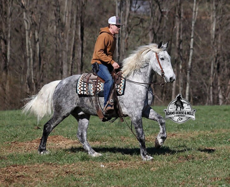 "AVAILABLE ON ONLINE HORSE AUCTION AT www DOT PlatinumEquineAuction DOT com BIDDING OPEN NOW thru SUNDAY | APRIL 19TH! *Final price will be determined on auction site* CONSIGNOR CONTACT INFO: Adams Horse & Mule Co. 606-308-2461 LOCATION: Mt. Vernon, KY All Smoked Out has Dapples the size of apples! Just try to count the dapples on this guy! Smokey is a stout built draftcross gelding standing around 15.2hh, he will weigh 1250lbs, he is 9 years old, and he is that super pretty dapple grey coloring with a silver mane and tail! He is one cool looking guy! Not only does he look cool, he is has all of the other boxes checked as well… he is Mr. Personality, as friendly as they come, loves attention and is very calm natured. Smokey is out of the same breeding program as several other top draftcross geldings that we have had over the last 4 years and every one of them has the right mind with the calm nature that makes them great family horses. Smokey has been in our program since last year and has completed the natural horsemanship training and does liberty work and he also knows some tricks, he will bow, lay down and set on his rump. Smokey is great on trails and he will cross creeks, ditches, logs and navigate rough rocky areas. He has a smooth jog, a VERY VERY nice easy to set lope, a good stop, turns a circle both ways and backs with ease! He has been exposed to all kinds of wildlife such as deer or turkey or other animals like cows or dogs and will go anywhere that he is asked too. He has been rode many miles in the mountains of Eastern Kentucky and encountered every obstacle possible on the trail. He will go up or down even the steepest slopes, across deep creeks, over downed trees, and over all types of rough terrain while still being sure footed. Smokey is not cinchy, cold backed, does not crib or weave. In addition to riding, Smokey has also been driven down the highways as well. Smokey is a super cool horse that anyone is sure to love!!! Feel free to call Eric 606-308-2461 with any questions.